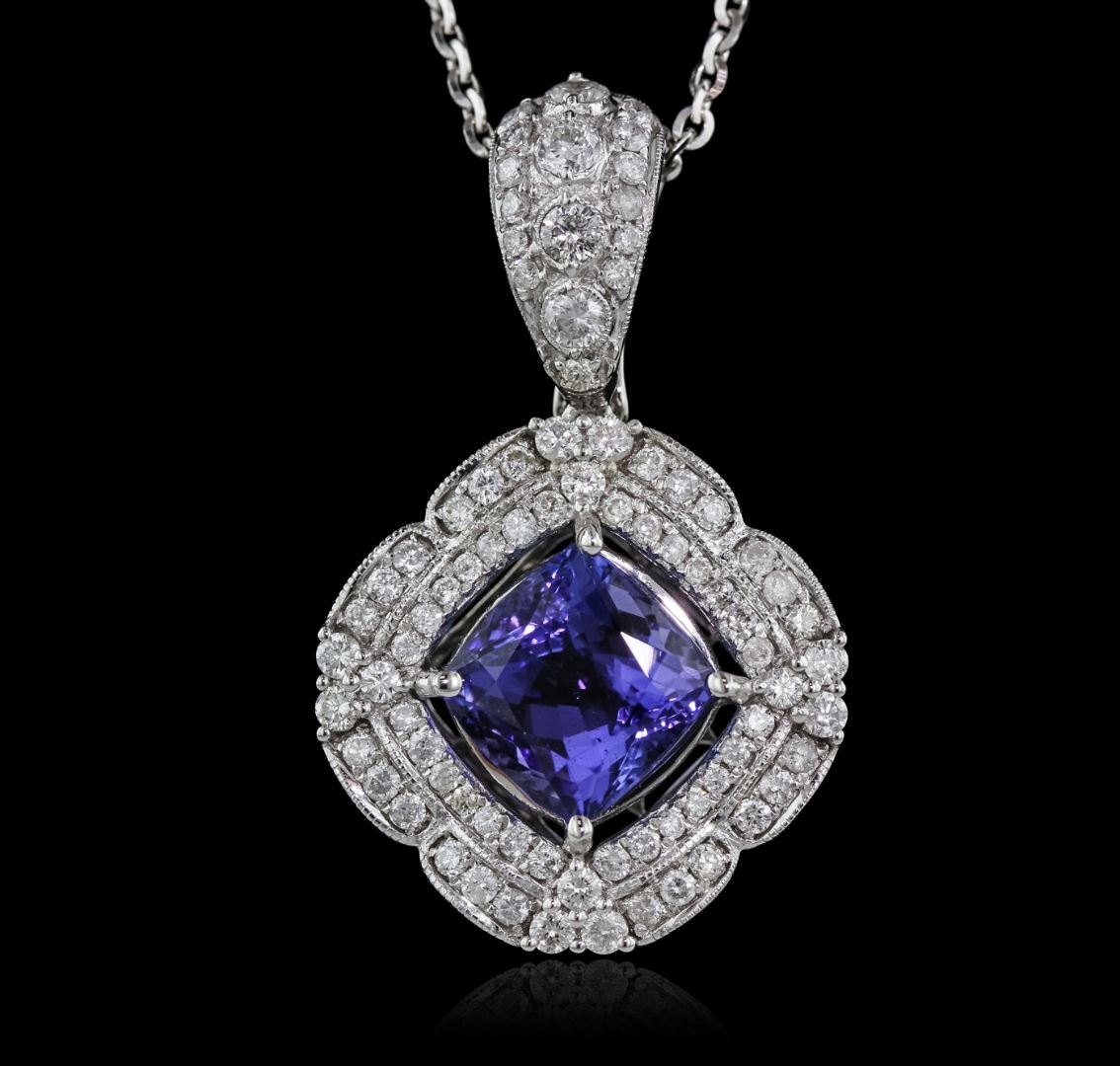 One electronically tested 14KT white gold Ladies combination cast & assembled pendant & chain 17.0" long, medium cable link with a lobster claw clasp with a bright polish finish. Condition is new. Identified with markings of "14K". Containing: One prong set square cushion modified brilliant cut natural tanzanite, measuring 7.78 x 7.56 x 4.99mm, approximate weight of 2.31ct., clarity is eye clean, type I, medium light, moderately strong, bluish violet color, (GIA bV 4/4), cut is very good. Colored gemstones are presumed to have been subjected to commonly used color/clarity enhancement processes. Four prong set round brilliant cut diamonds, measuring 3.00 - 3.00 x 1.80mm (depth est.) approximate. Total Weight of 4 Stones = 0.40ct. Clarity: I-1 to I-2. Color: I - J, Cut is Good. Seventy-Two prong set round brilliant cut diamonds, measuring 1.50 - 1.30 x 0.84mm (depth est.) approximate. Total Weight of 72 Stones = 0.72ct. Clarity: I-1 to I-2. Color: I - J, Cut is Good. Total Weight of Colored Stones 2.31ct. Total Weight of Diamonds 1.12ct. Total Weight of Pendant & Chain 14.60 grams. GGL Appraised at $10,745.00.