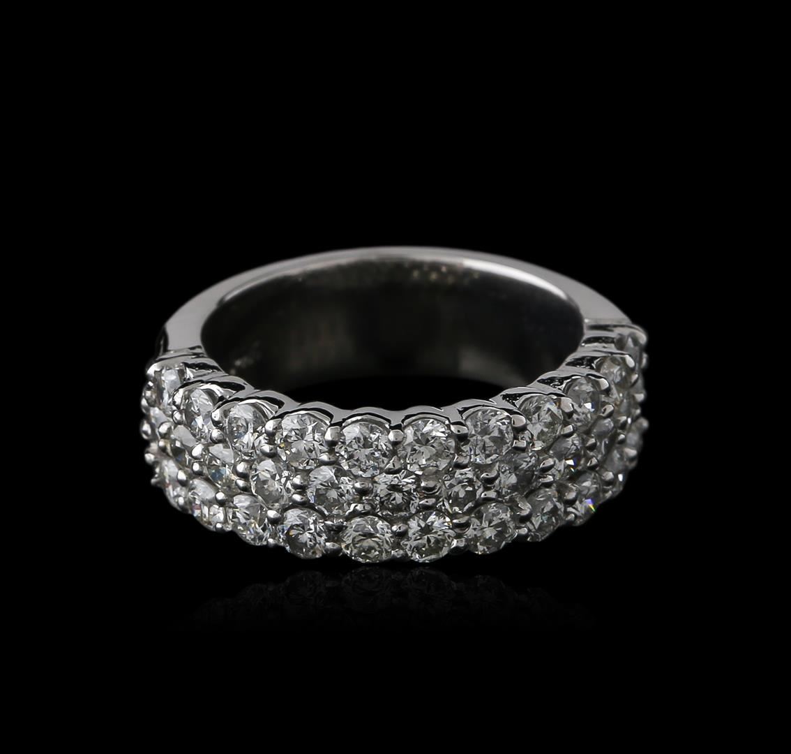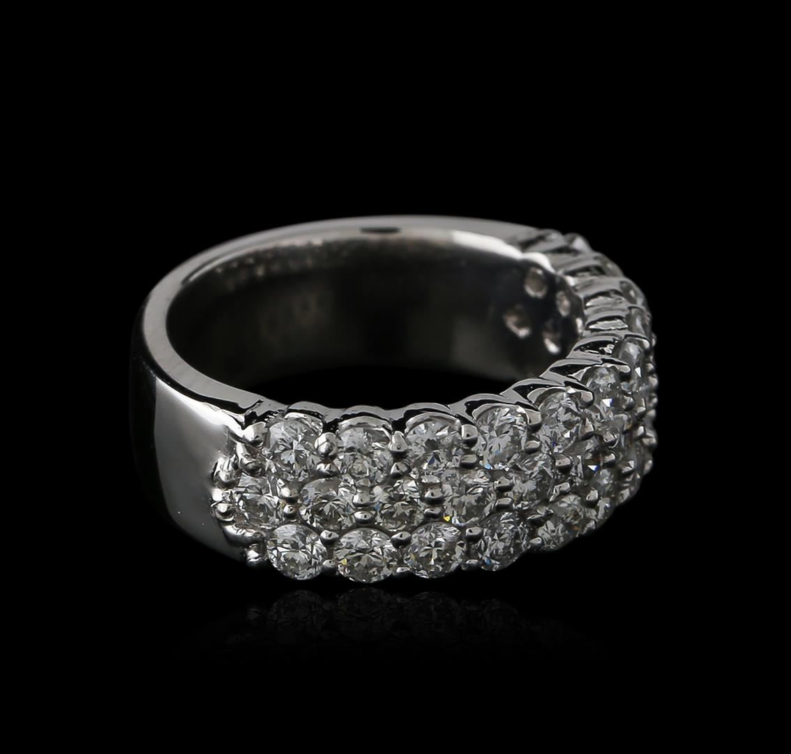 One electronically tested 14KT white gold ladies cast diamond ring with a flat shank with rounded edges with a bright polish finish. Identified with markings of "14K". Condition is new. Containing: Thirty-Four prong set round brilliant cut diamonds, measuring 2.50 - 2.50 x 1.50mm (depth est.) approximate total weight of 34 Stones = 2.31ct. Clarity: SI-1 to I-1. Color: H - J, Cut is Good. Diamonds are graded in the mounting, unless otherwise stated. Total Weight of Diamonds 2.31ct. Total Weight of Ring 9.10 grams. GGL Appraised at $4,430.00.