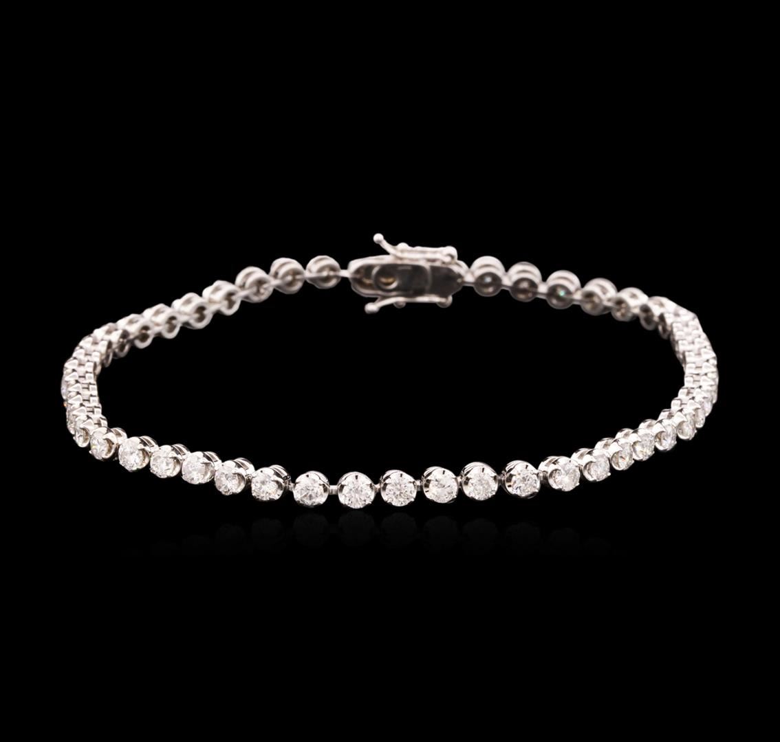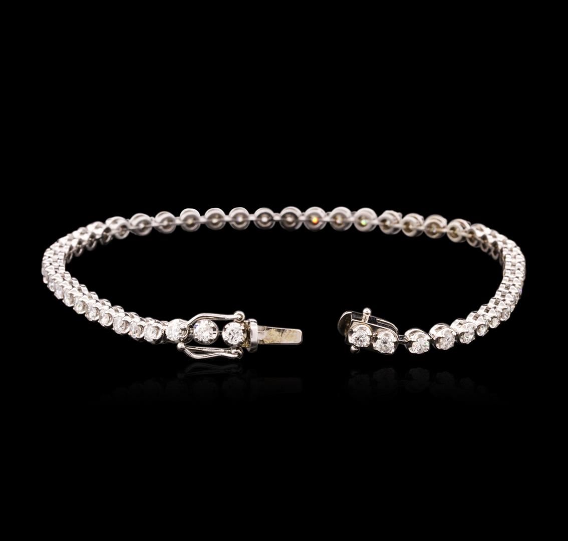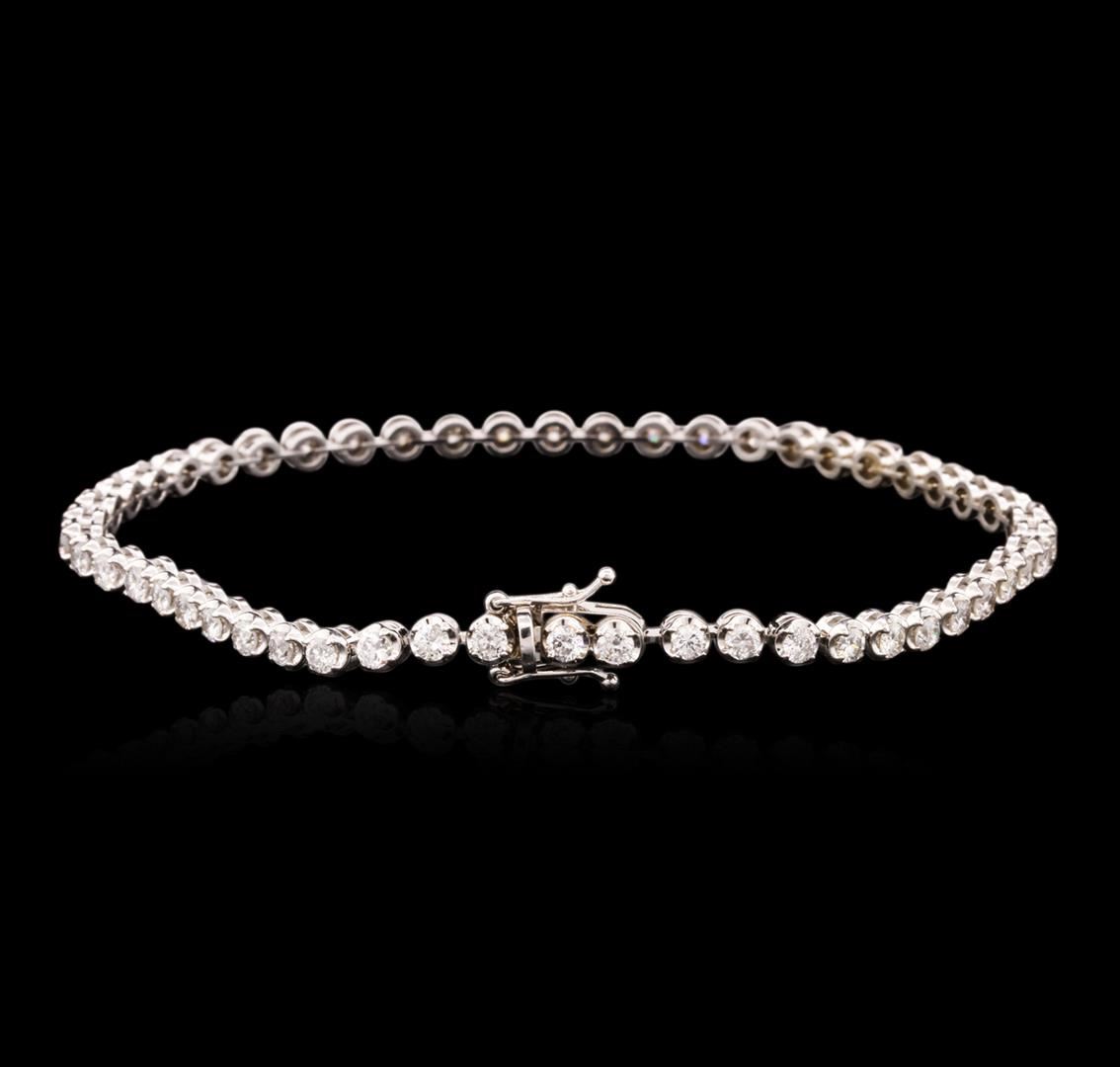 One electronically tested 14KT white gold ladies cast diamond tennis bracelet with a hidden box clasp with a bright polish finish. Measurements: 7" in inch Identified with markings of "14K". Condition is new. Containing: Fifty-Two prong set round brilliant cut diamonds, measuring 2.30 - 2.30 x 1.38mm (depth est.) approximate total weight of 52 Stones = 2.31ct. Clarity: SI-1 to SI-2. Color: I - J, Cut is Good. All diamonds are graded in the mounting, unless otherwise stated. Total Weight of Diamonds 2.31ct. Total Weight of Tennis Bracelet 9.20 grams. GGL Appraised at $5,340.00.