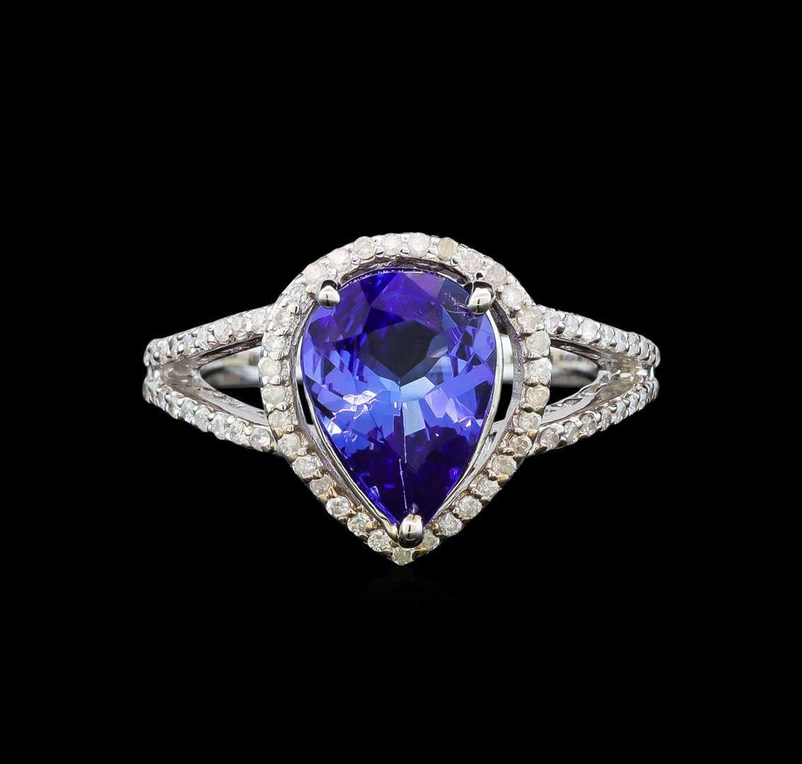 One electronically tested 14KT white gold ladies cast tanzanite and diamond ring with a bright polish finish. Identified with markings of "14K". Condition is new. Containing: One prong set triangle modified brilliant cut natural tanzanite, measuring 10.36 x 7.95 x 4.68mm, approximate weight of 2.32ct., clarity is eye clean, type I, medium light, very slightly grayish, violet color, (GIA V 4/3), cut is good. Sixty-Eight prong set round brilliant cut diamonds, measuring 1.10 - 1.10 x 0.66mm (depth est.) approximate total weight of 68 Stones = 0.33ct. Clarity: I-1 to I-2. Color: I - J. Colored gemstones are presumed to have been subjected to commonly used enhancement processes. All diamonds and colored gemstones are graded in the mounting, unless otherwise stated. Total Weight of Colored Stones 2.32ct. Total Weight of Diamonds 0.33ct. Total Weight of Ring 3.80 grams. GGL Appraised at $3,230.00.