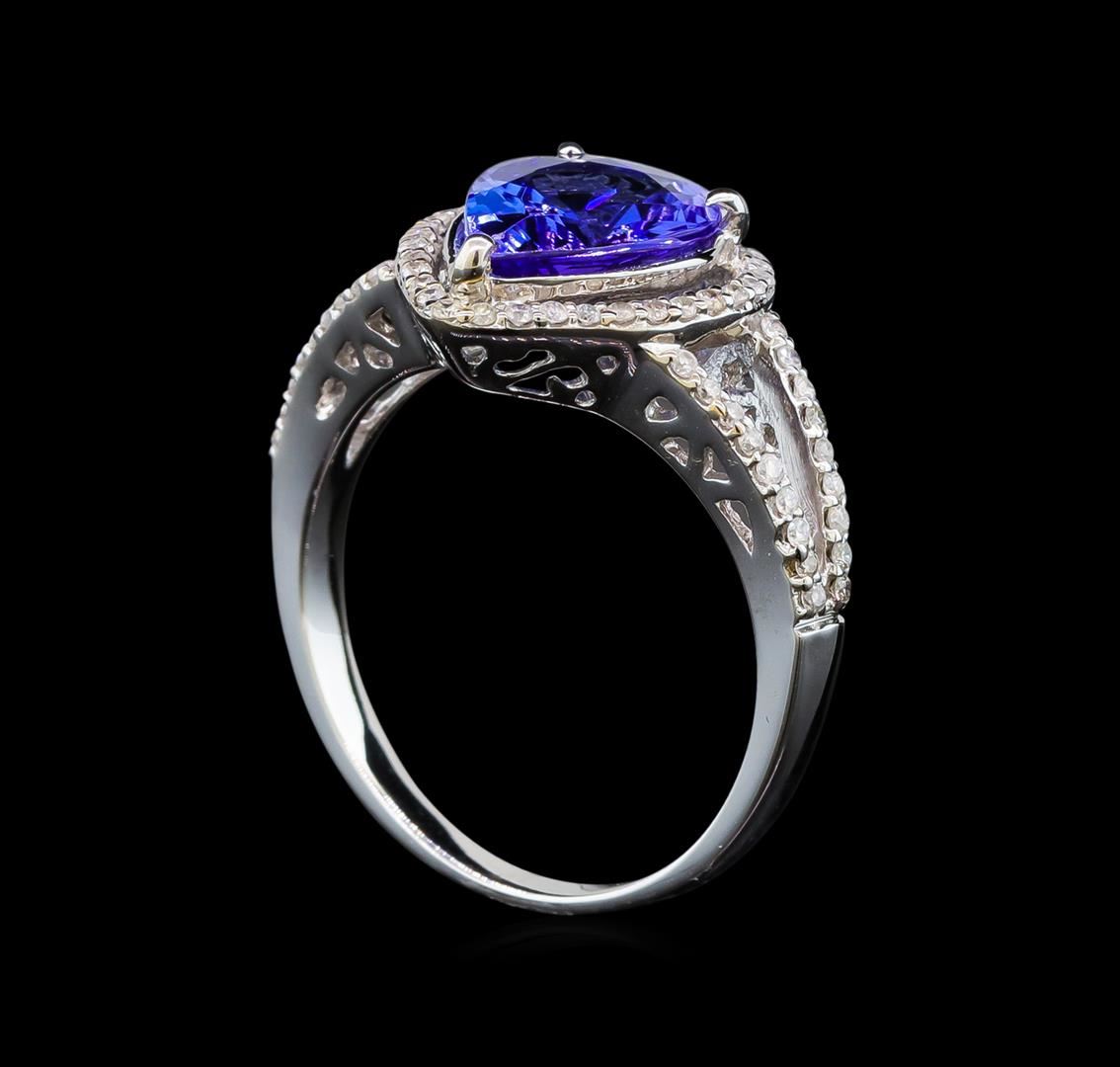 One electronically tested 14KT white gold ladies cast tanzanite and diamond ring with a bright polish finish. Identified with markings of "14K". Condition is new. Containing: One prong set triangle modified brilliant cut natural tanzanite, measuring 10.36 x 7.95 x 4.68mm, approximate weight of 2.32ct., clarity is eye clean, type I, medium light, very slightly grayish, violet color, (GIA V 4/3), cut is good. Sixty-Eight prong set round brilliant cut diamonds, measuring 1.10 - 1.10 x 0.66mm (depth est.) approximate total weight of 68 Stones = 0.33ct. Clarity: I-1 to I-2. Color: I - J. Colored gemstones are presumed to have been subjected to commonly used enhancement processes. All diamonds and colored gemstones are graded in the mounting, unless otherwise stated. Total Weight of Colored Stones 2.32ct. Total Weight of Diamonds 0.33ct. Total Weight of Ring 3.80 grams. GGL Appraised at $3,230.00.