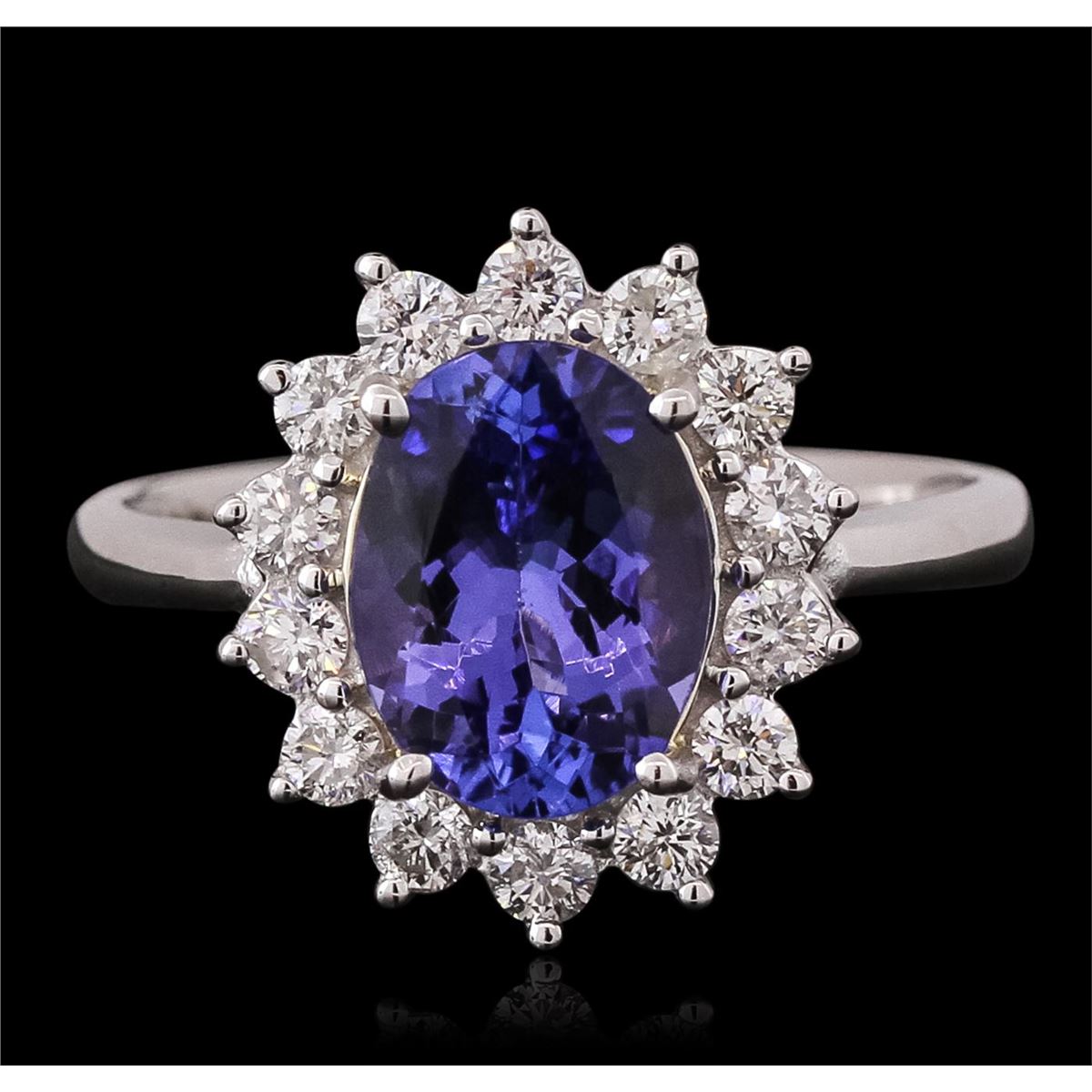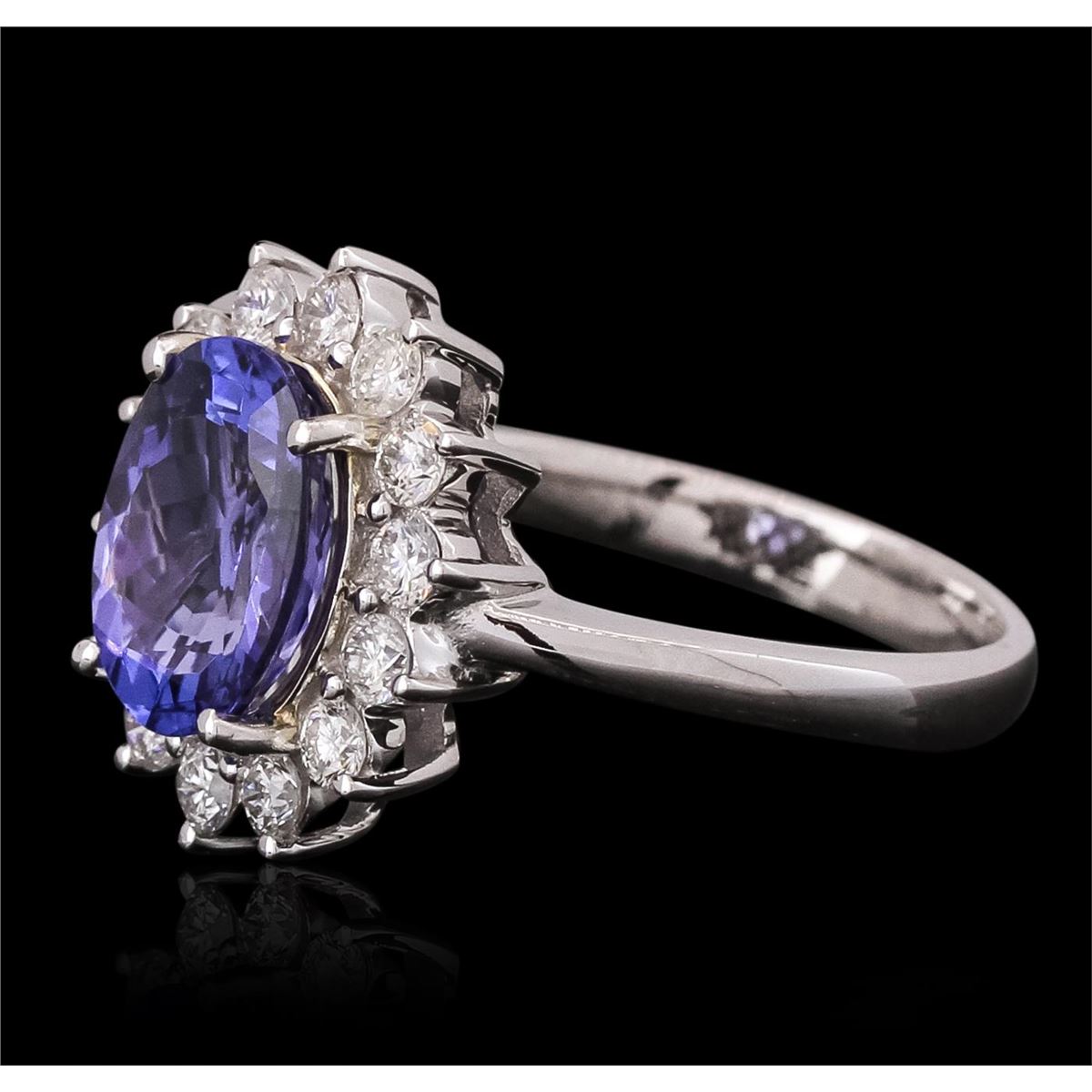 One electronically tested 14KT white gold ladies cast tanzanite & diamond ring with a bright finish. The featured tanzanite is set within a diamond bezel, supported by an elaborate white gold under gallery, completed by a three millimeter wide band. Identified with markings of "14K". Condition is new, good workmanship. Containing: One prong set oval mixed cut natural tanzanite, measuring 9.70 x 7.33 x 4.80mm, approximate weight of 2.33ct., clarity is eye clean, type I, medium dark, slightly grayish, bluish violet color, (GIA bV 6/2), cut is good. Transmitting light with no distortion, transparent. Graded in the setting. Tanzanite is a very rare gemstone that is only found in the country of Tanzania. Originally discovered in 1967. Tiffany & Company, named the stone Tanzanite. It is found in the Usumburu Mountains that border the Umba Valley of northern Tanzania. Tanzanite occurs in gray, brown, violet, blue, reddish-purple, & green. The gem is interesting because of its exceptional pleochroism. Rotated in different directions a tanzanite will exhibit multiple changes of color. Tanzanite has a low tolerance to ultrasonic cleaning, and should not be cleaned using this method. Fourteen prong set round brilliant cut diamonds, measuring 2.30 - 2.20 x 1.38mm (depth est.) approximate total weight of 14 Stones = 0.60ct. Graded in the setting. Clarity: SI-2 to I-2. Color: H - I. Total Weight of Colored Stones 2.33ct. Total Weight of Diamonds 0.60ct. Total Weight of Ring 4.32 grams. AIG Appraised at $6,200.00.