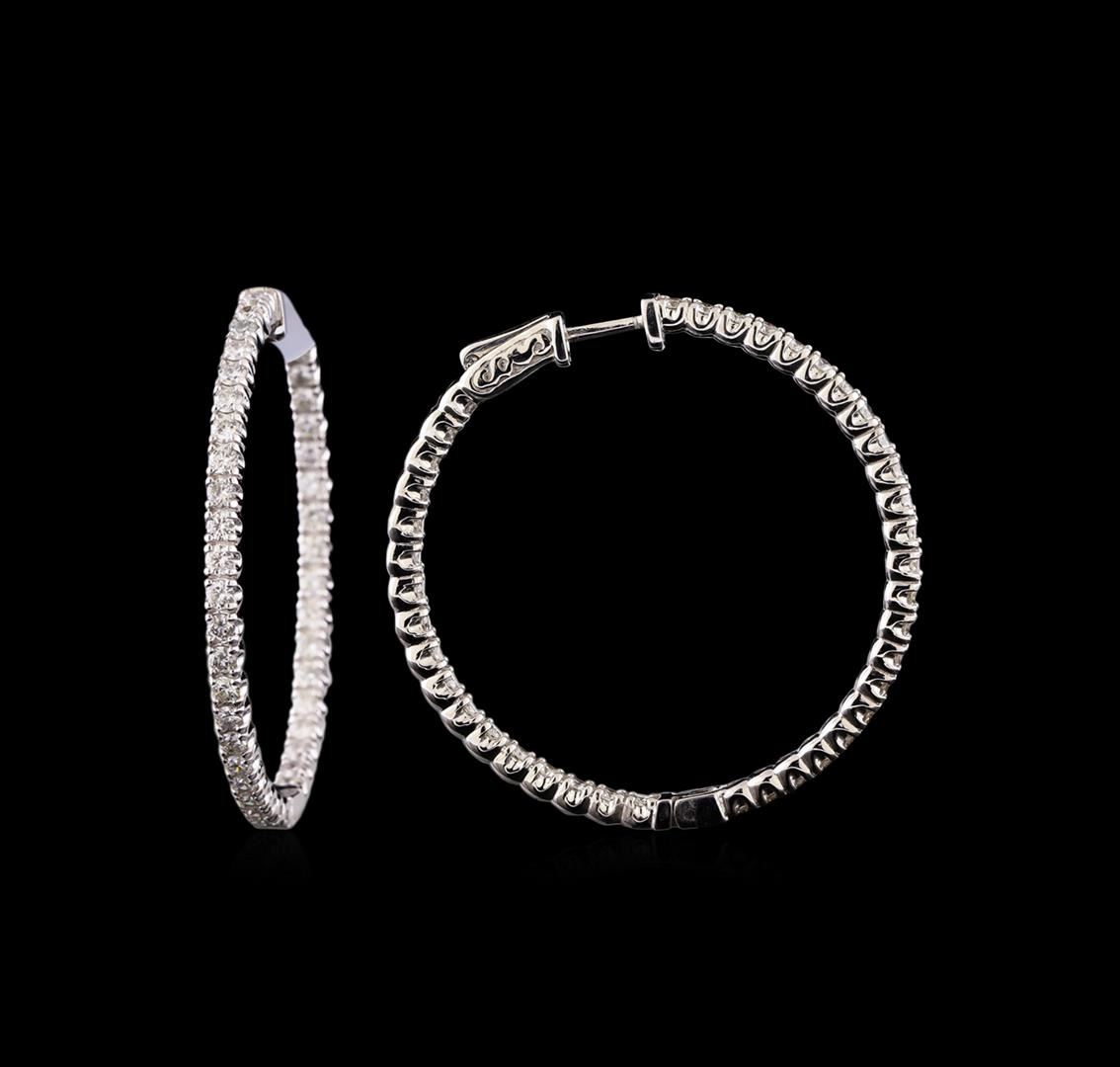 One pair electronically tested 14KT white gold ladies cast hoop earrings with hinged clip backs with a bright polish finish. Measurements: 1.50" in diameter Condition is new. Containing: Eighty prong set round brilliant cut diamonds, measuring 2.00 - 2.00 x 1.20mm (depth est.) approximate total weight of 80 Stones = 2.34ct. Clarity: SI-1 to I-1. Color: I - J, Cut is Good. All diamonds are graded in the mounting, unless otherwise stated. Total Weight of Diamonds 2.34ct. Total Weight of Earrings 14.80 grams. GGL Appraised at $11,080.00.
