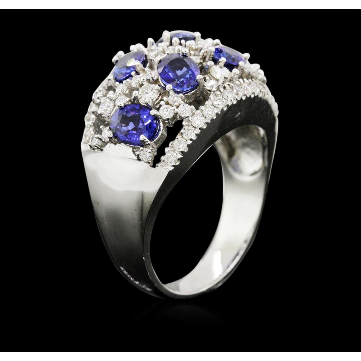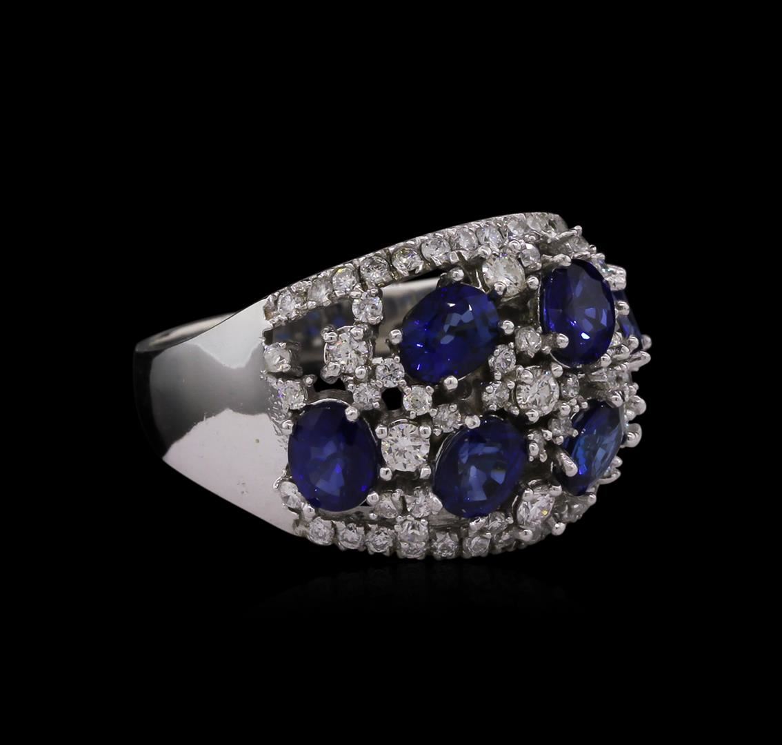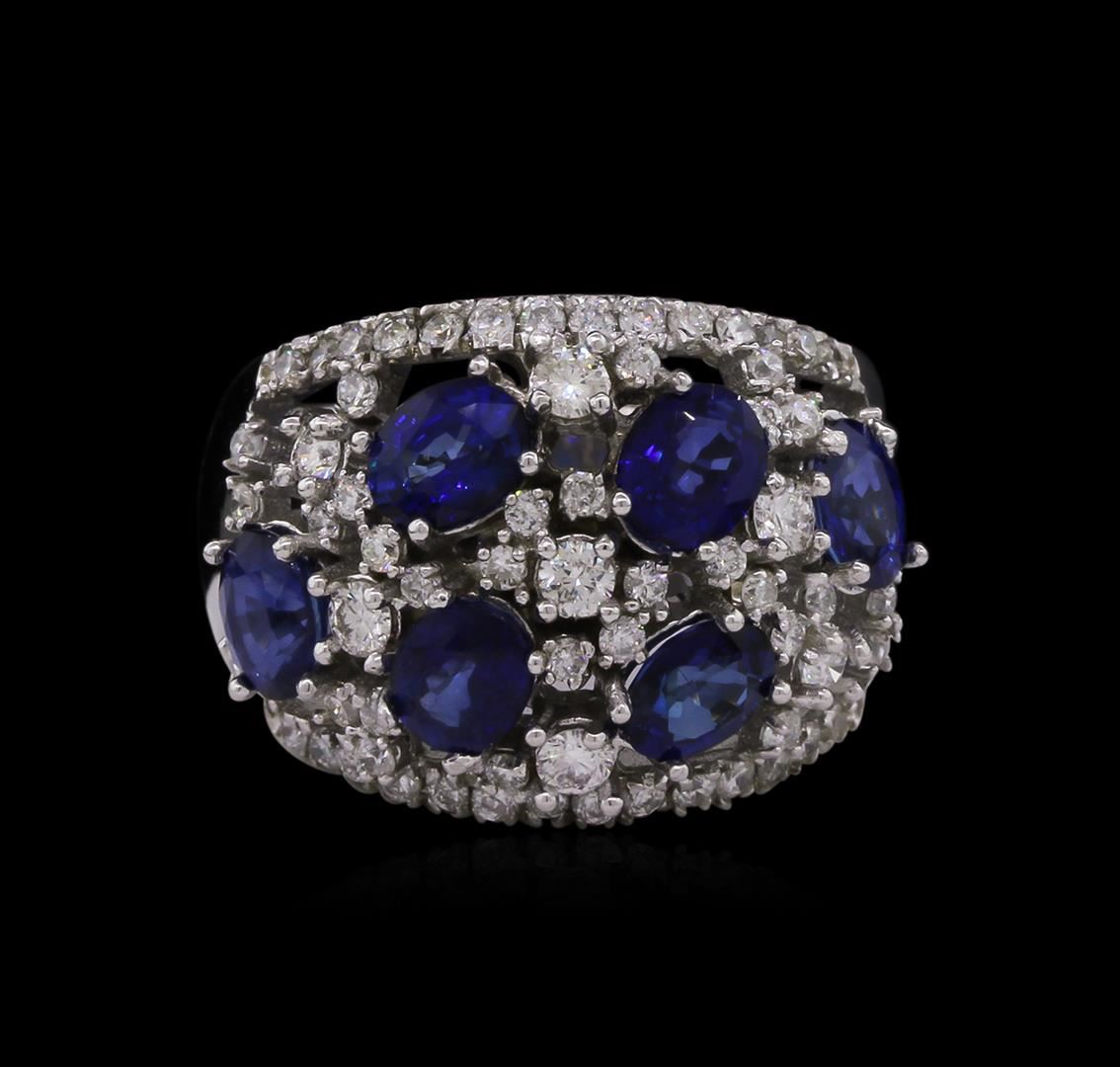One electronically tested 14KT white gold ladies cast sapphire and diamond ring with a bright polish finish. Identified with markings of "K14". Condition is new. Containing: Six prong set oval modified brilliant cut natural blue sapphires, measuring 5.00 x 3.80 x 2.47mm, approximate total weight of 2.34ct., clarity is eye clean, type II, medium, moderately strong, blue color, (GIA B 5/4), cut is very good. Fifty-Eight prong set round brilliant cut diamonds, measuring 2.00 - 1.30 x 0.99mm (depth est.) approximate total weight of 58 Stones = 0.60ct. Clarity: SI-2 to I-2. Color: H - I, Cut is Good. Colored gemstones are presumed to have been subjected to commonly used enhancement processes. All diamonds and colored gemstones are graded in the mounting, unless otherwise stated. Total Weight of Colored Stones 2.34ct. Total Weight of Diamonds 0.60ct. Total Weight of Ring 8.00 grams. GGL Appraised at $4,170.00.