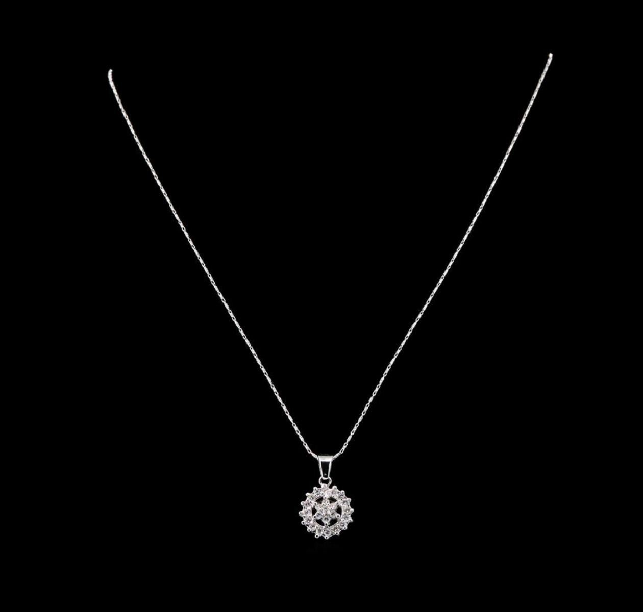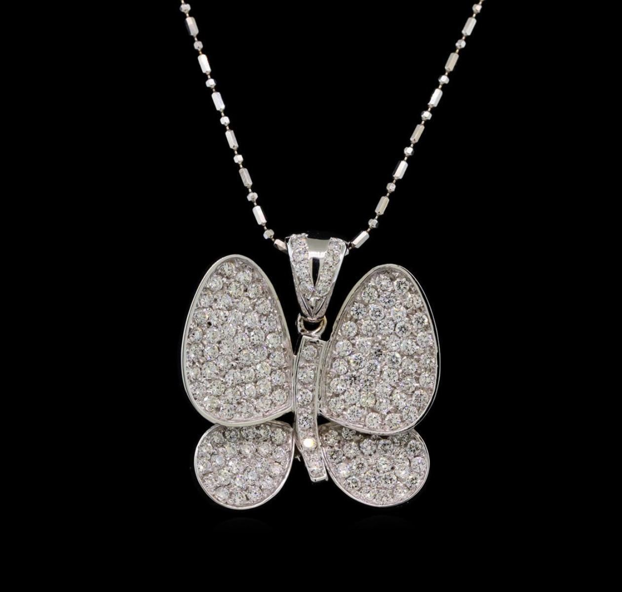 One electronically tested 14KT white gold ladies cast diamond pendant & chain 18.0" long, with a spring ring clasp with a bright polish finish. Identified with markings of "14K". Condition is new. Containing: One Hundred Forty-Four prong set round brilliant cut diamonds, measuring 1.80 - 1.80 x 1.08mm (depth est.) approximate total weight of 144 Stones = 2.35ct. Clarity: VS-2 to SI-1. Color: I - J, Cut is Good. All diamonds are graded in the mounting, unless otherwise stated. Total Weight of Diamonds 2.35ct. Total Weight of Pendant & Chain 8.20 grams. GGL Appraised.