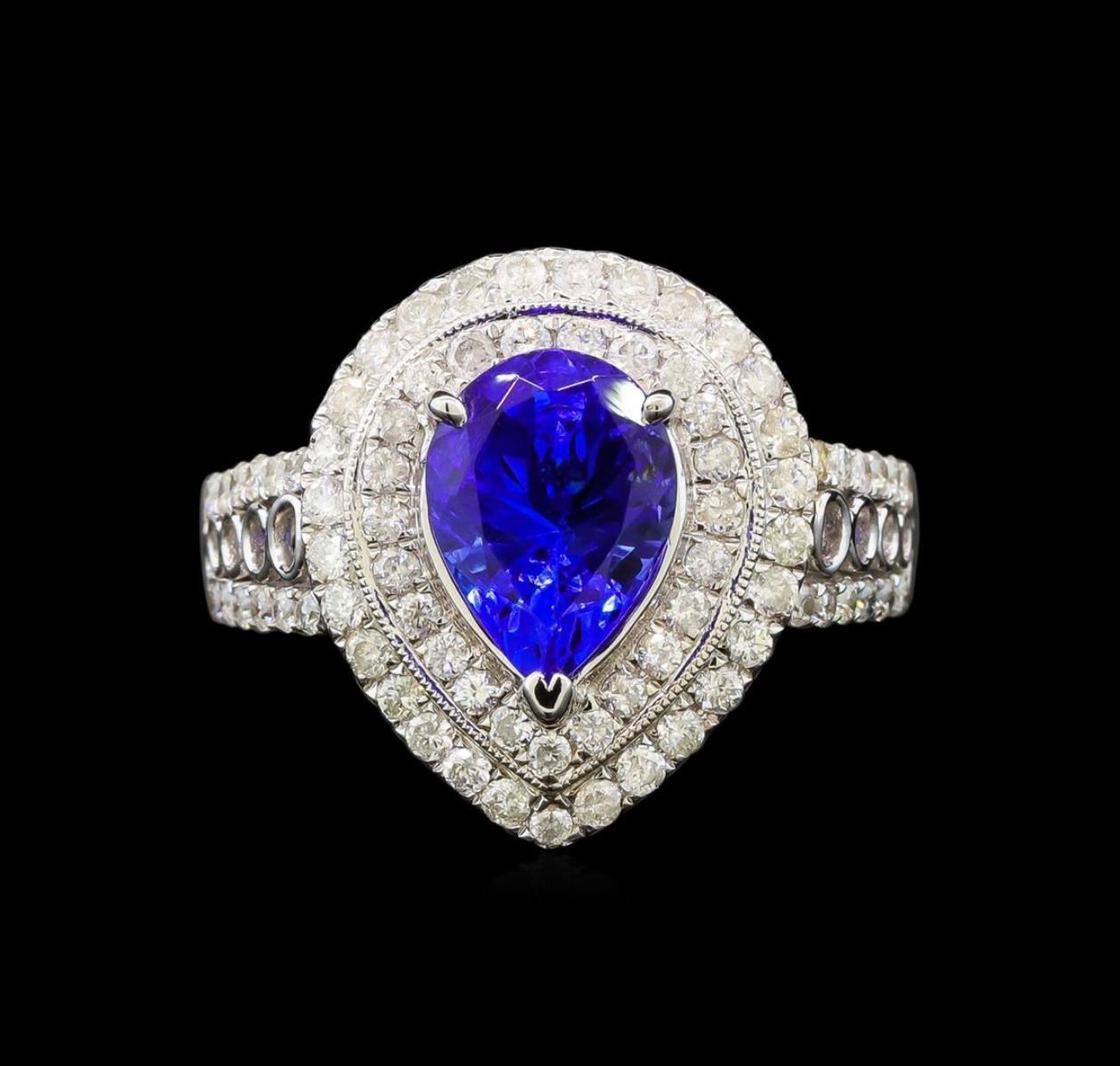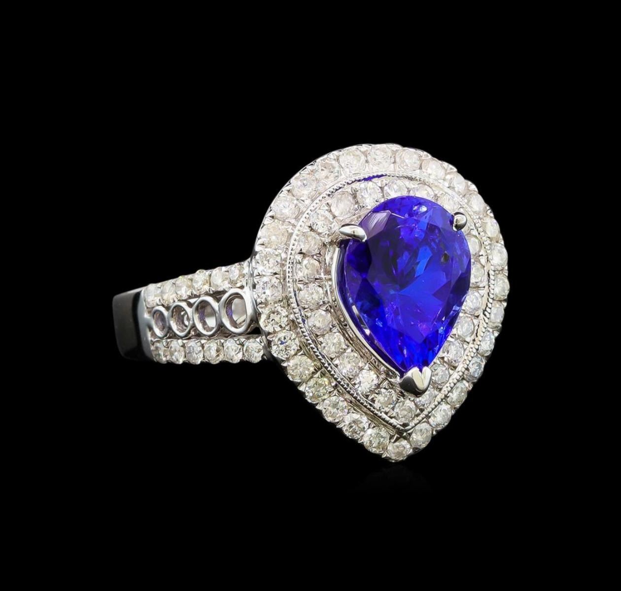 One electronically tested 14KT white gold ladies cast tanzanite and diamond ring with a bright polish finish. Identified with markings of "14K". Condition is new. Containing: One prong set pear modified brilliant cut natural tanzanite, measuring 11.00 x 7.00 x 4.55mm, approximate weight of 2.35ct., clarity is eye clean, type I, medium, moderately strong, violetish blue color, (GIA vB 5/4), cut is good. Seventy-Six prong set round brilliant cut diamonds, measuring 1.50 - 1.50 x 0.90mm (depth est.) approximate total weight of 76 Stones = 0.89ct. Clarity: SI-2 to I-2. Color: I - J. Colored gemstones are presumed to have been subjected to commonly used enhancement processes. All diamonds and colored gemstones are graded in the mounting, unless otherwise stated. Total Weight of Colored Stones 2.35ct. Total Weight of Diamonds 0.89ct. Total Weight of Ring 6.60 grams. GGL Appraised.