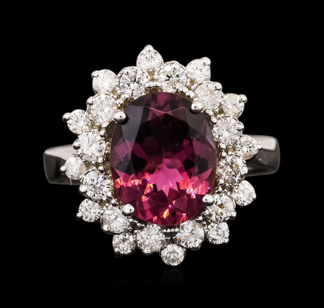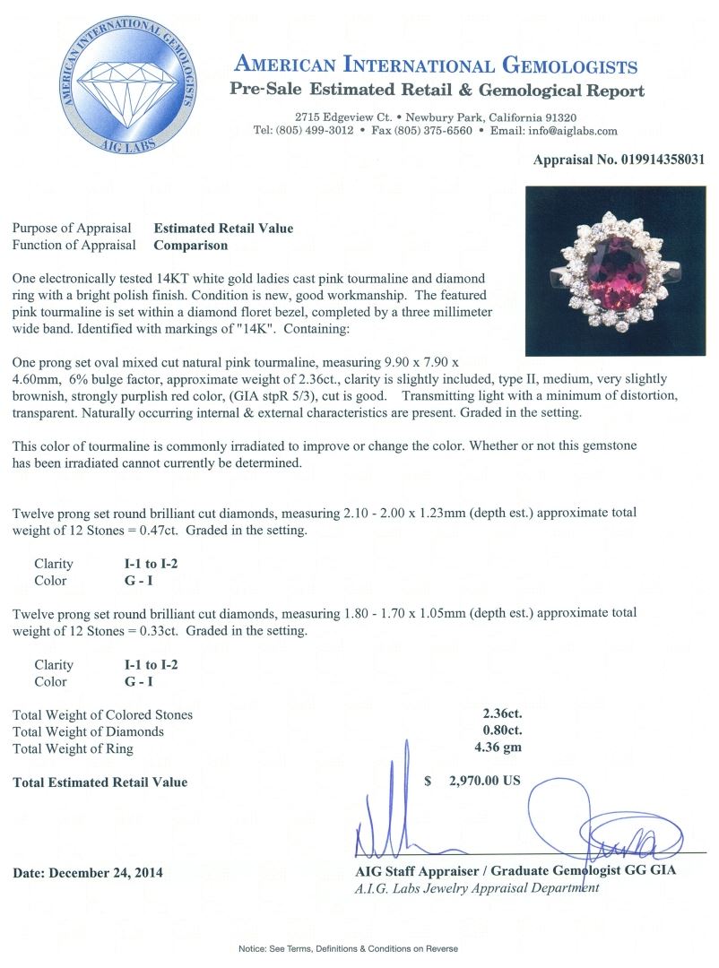 One electronically tested 14KT white gold ladies cast pink tourmaline and diamond ring with a bright polish finish. The featured pink tourmaline is set within a diamond floret bezel, completed by a three millimeter wide band. Identified with markings of "14K". Condition is new, good workmanship. Containing: One prong set oval mixed cut natural pink tourmaline, measuring 9.90 x 7.90 x 4.60mm, 6% bulge factor, approximate weight of 2.36ct., clarity is slightly included, type II, medium, very slightly brownish, strongly purplish red color, (GIA stpR 5/3), cut is good. Transmitting light with a minimum of distortion, transparent. Naturally occurring internal & external characteristics are present. Graded in the setting. This color of tourmaline is commonly irradiated to improve or change the color. Whether or not this gemstone has been irradiated cannot currently be determined. Twelve prong set round brilliant cut diamonds, measuring 2.10 - 2.00 x 1.23mm (depth est.) approximate total weight of 12 Stones = 0.47ct. Graded in the setting. Clarity: I-1 to I-2. Color: G - I Twelve prong set round brilliant cut diamonds, measuring 1.80 - 1.70 x 1.05mm (depth est.) approximate total weight of 12 Stones = 0.33ct. Graded in the setting. Clarity: I-1 to I-2. Color: G - I. Total Weight of Colored Stones 2.36ct. Total Weight of Diamonds 0.80ct. Total Weight of Ring 4.36 grams. AIG Appraised at $2,970.00.