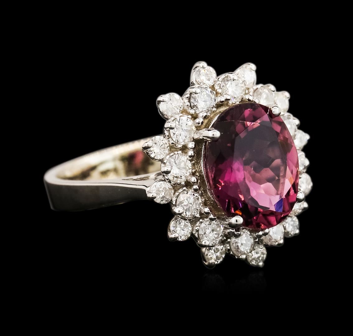 One electronically tested 14KT white gold ladies cast pink tourmaline and diamond ring with a bright polish finish. The featured pink tourmaline is set within a diamond floret bezel, completed by a three millimeter wide band. Identified with markings of "14K". Condition is new, good workmanship. Containing: One prong set oval mixed cut natural pink tourmaline, measuring 9.90 x 7.90 x 4.60mm, 6% bulge factor, approximate weight of 2.36ct., clarity is slightly included, type II, medium, very slightly brownish, strongly purplish red color, (GIA stpR 5/3), cut is good. Transmitting light with a minimum of distortion, transparent. Naturally occurring internal & external characteristics are present. Graded in the setting. This color of tourmaline is commonly irradiated to improve or change the color. Whether or not this gemstone has been irradiated cannot currently be determined. Twelve prong set round brilliant cut diamonds, measuring 2.10 - 2.00 x 1.23mm (depth est.) approximate total weight of 12 Stones = 0.47ct. Graded in the setting. Clarity: I-1 to I-2. Color: G - I Twelve prong set round brilliant cut diamonds, measuring 1.80 - 1.70 x 1.05mm (depth est.) approximate total weight of 12 Stones = 0.33ct. Graded in the setting. Clarity: I-1 to I-2. Color: G - I. Total Weight of Colored Stones 2.36ct. Total Weight of Diamonds 0.80ct. Total Weight of Ring 4.36 grams. AIG Appraised at $2,970.00.