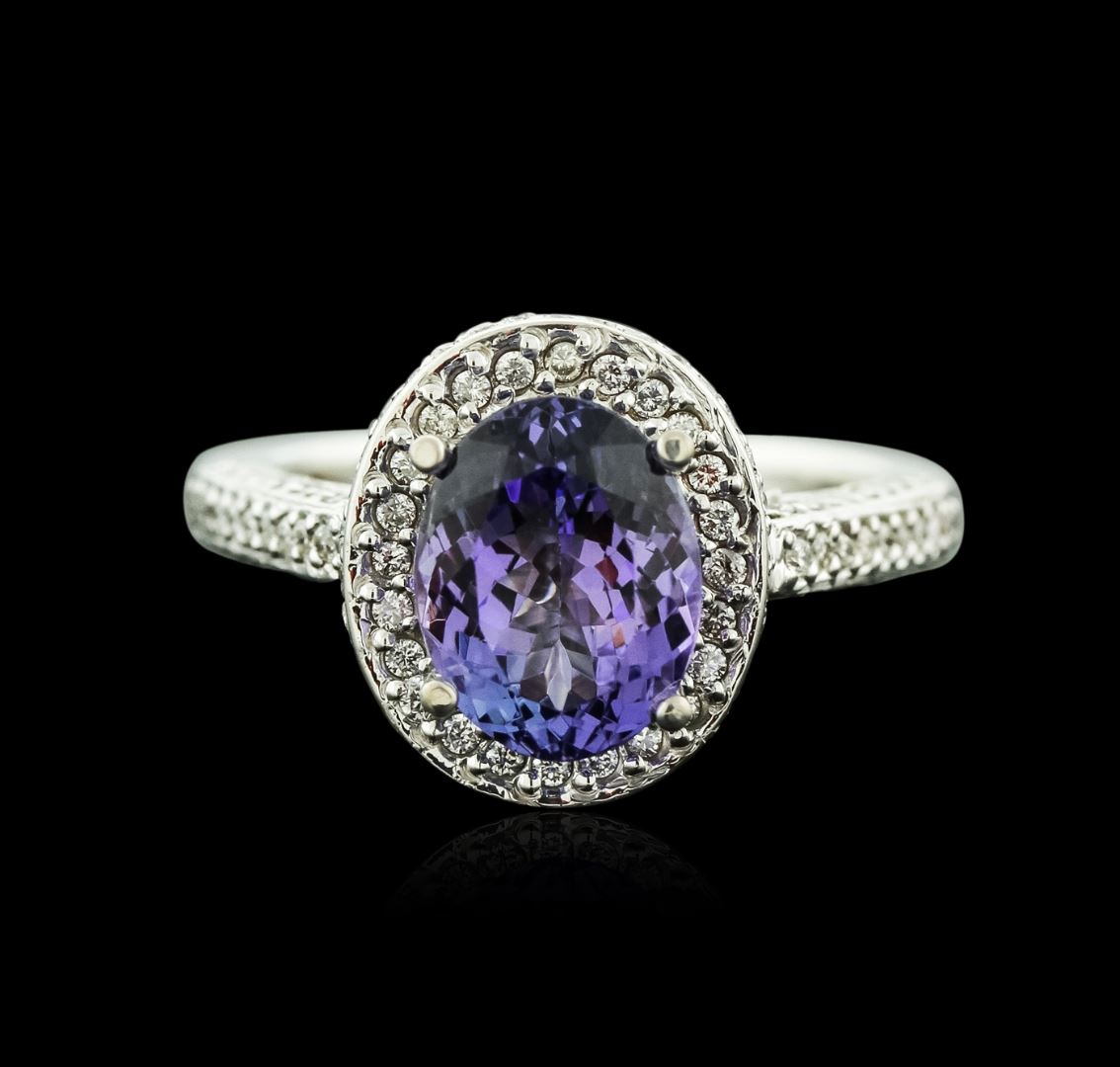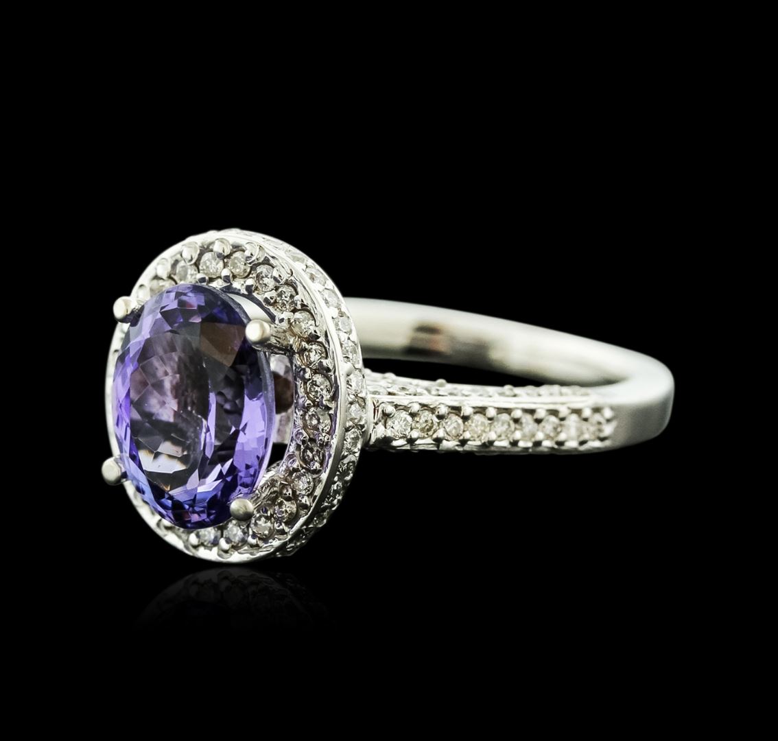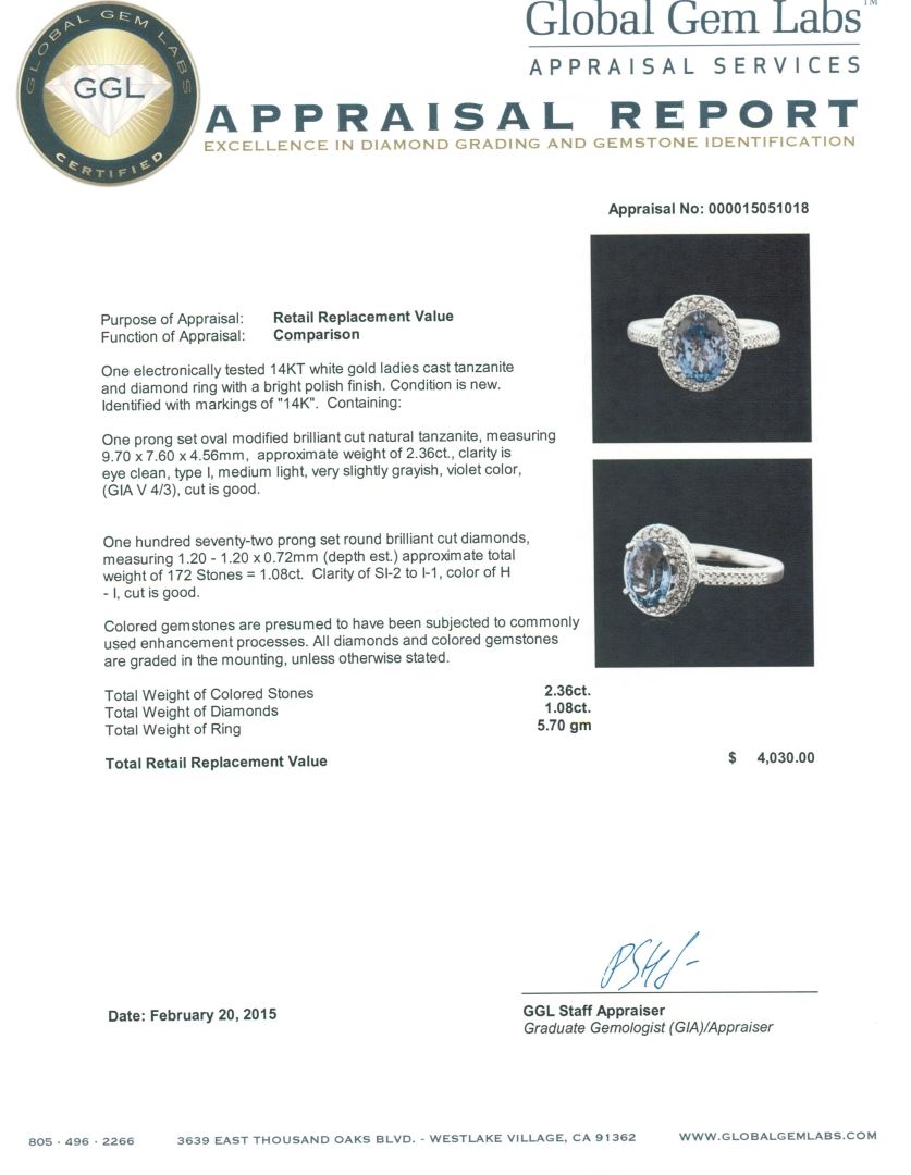 One electronically tested 14KT white gold ladies cast tanzanite and diamond ring with a bright polish finish. Identified with markings of "14K". Condition is new. Containing: One prong set oval modified brilliant cut natural tanzanite, measuring 9.70 x 7.60 x 4.56mm, approximate weight of 2.36ct., clarity is eye clean, type I, medium light, very slightly grayish, violet color, (GIA V 4/3), cut is good. One Hundred Seventy-Two prong set round brilliant cut diamonds, measuring 1.20 - 1.20 x 0.72mm (depth est.) approximate total weight of 172 Stones = 1.08ct. Clarity: SI-2 to I-1. Color: H - I, Cut is Good. Colored gemstones are presumed to have been subjected to commonly used enhancement processes. All diamonds and colored gemstones are graded in the mounting, unless otherwise stated. Total Weight of Colored Stones 2.36ct. Total Weight of Diamonds 1.08ct. Total Weight of Ring 5.70 grams. GGL Appraised at $4,030.00.