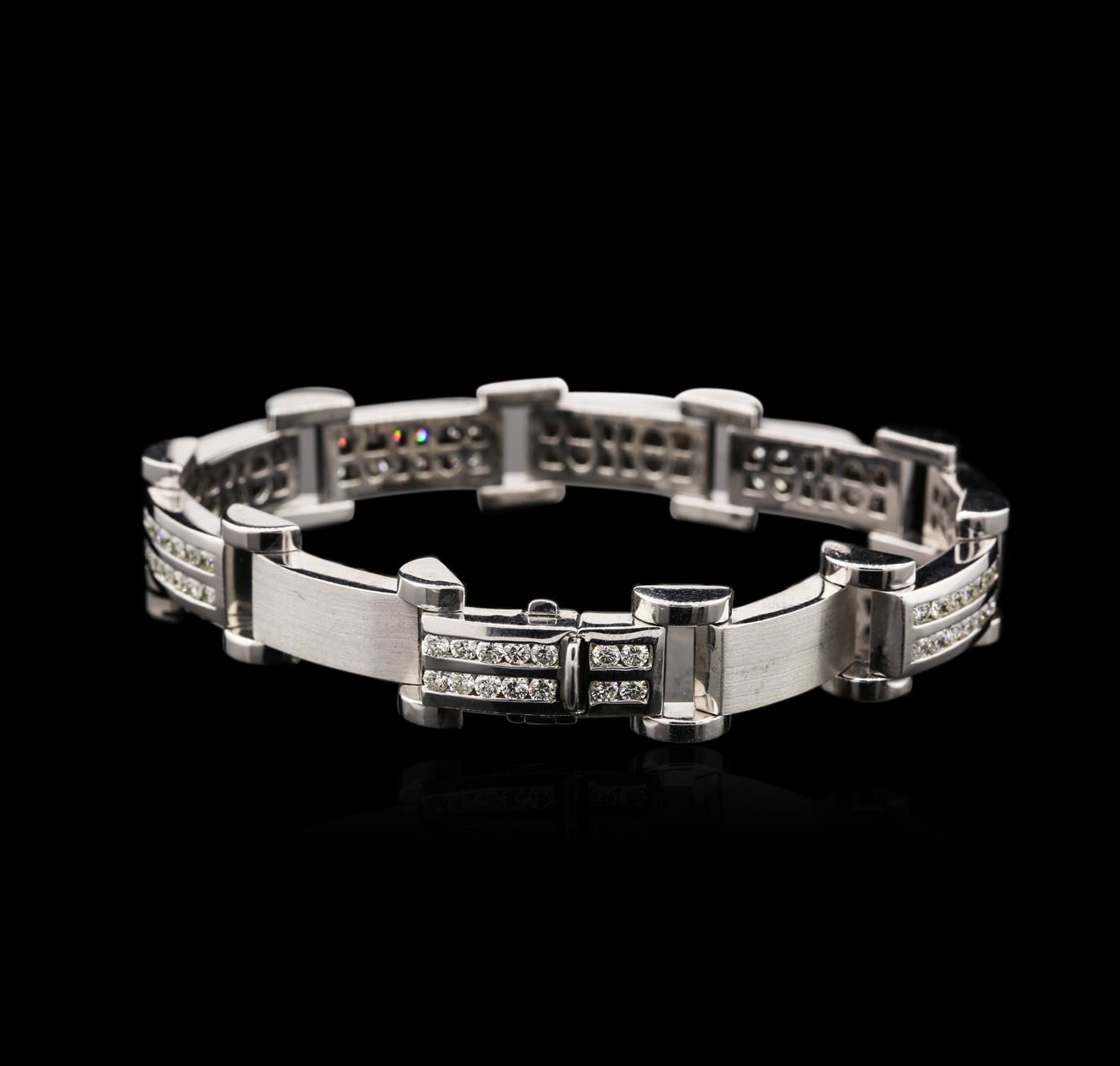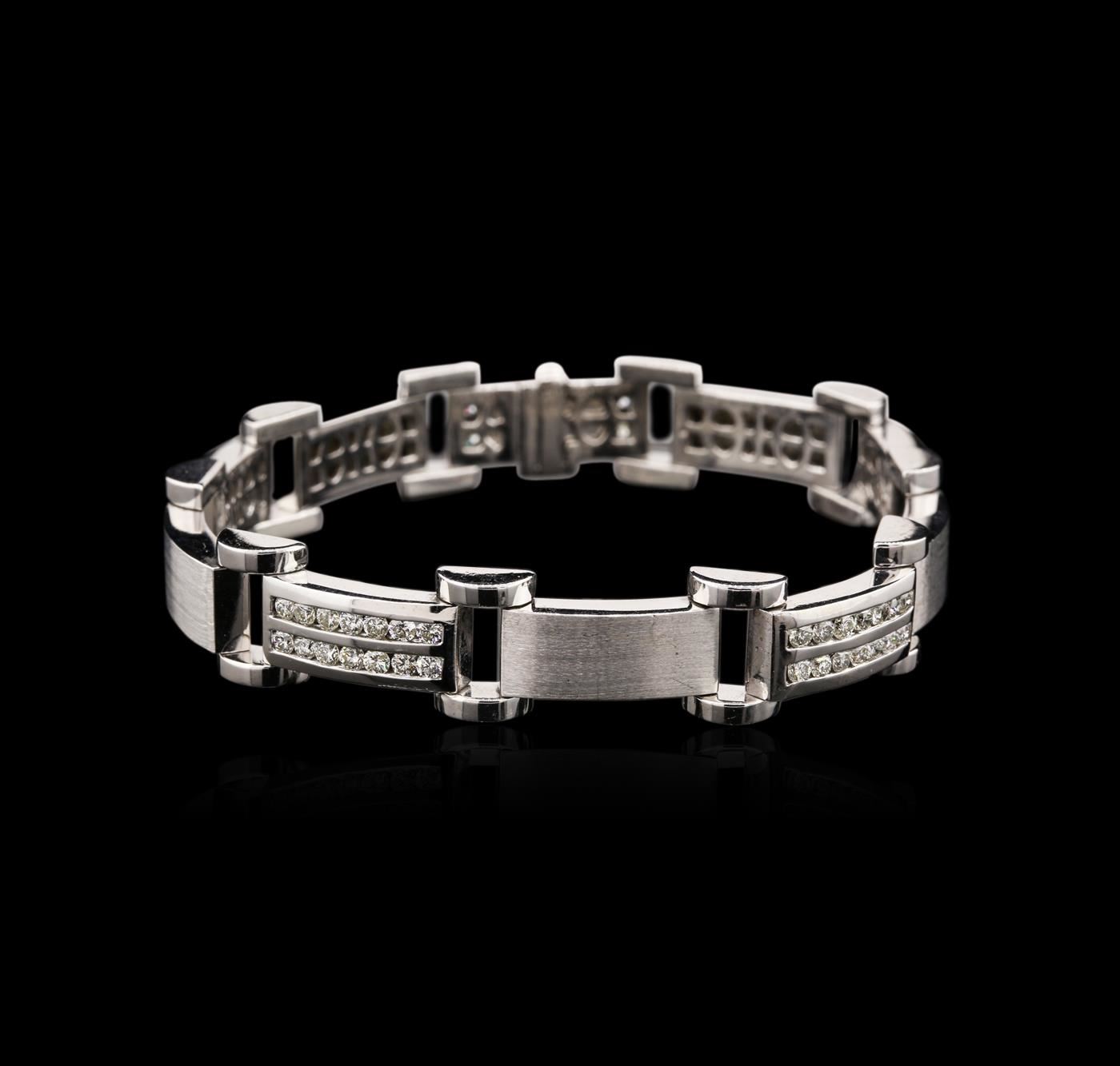 One electronically tested 14KT white gold mens cast diamond bracelet with a hidden box clasp with safety closer with a brushed finish. Measurements: 8.50" in length Identified with markings of "14K". Condition is new. Containing: Seventy channel set round brilliant cut diamonds, measuring 2.10 - 2.10 x 1.26mm (depth est.) approximate total weight of 70 Stones = 2.37ct. Clarity: SI-1 to SI-2. Color: J - K. All diamonds are graded in the mounting, unless otherwise stated. Total Weight of Diamonds 2.37ct. Total Weight of Bracelet 60.60 grams. GGL Appraised at $11,210.00.