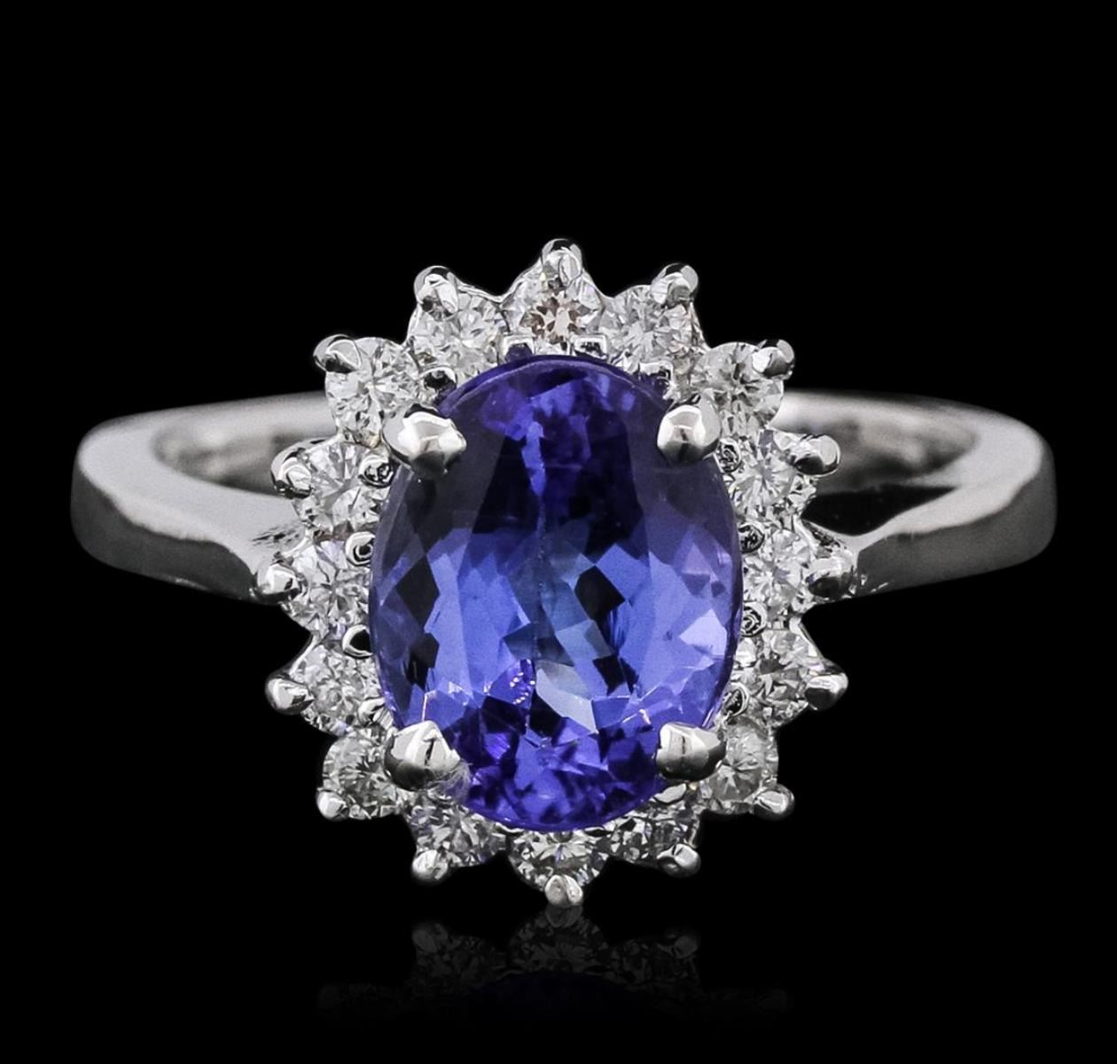 One electronically tested 14KT white gold ladies cast tanzanite and diamond ring with a bright polish finish. The featured tanzanite is set within a diamond bezel, completed by a two and one-half millimeter wide band. Identified with markings of "14K". Condition is new, good workmanship. Containing: One prong set oval mixed cut natural tanzanite, measuring 9.25 x 7.50 x 4.75mm, 6% bulge factor, approximate weight of 2.37ct., clarity is eye clean, type I, medium dark, very slightly grayish, bluish violet color, (GIA bV 6/3), cut is good. Transmitting light with no distortion, transparent. Graded in the setting. Tanzanite is a very rare gemstone that is only found in the country of Tanzania. Originally discovered in 1967. Tiffany & Company, named the stone Tanzanite. It is found in the Usumburu Mountains that border the Umba Valley of northern Tanzania. Tanzanite occurs in gray, brown, violet, blue, reddish-purple, & green. The gem is interesting because of its exceptional pleochroism. Rotated in different directions a tanzanite will exhibit multiple changes of color. Tanzanite has a low tolerance to ultrasonic cleaning, and should not be cleaned using this method. Sixteen prong set round brilliant cut diamonds, measuring 2.10 - 2.00 x 1.23mm (depth est.) approximate total weight of 16 Stones = 0.60 ct. Graded in the setting. Clarity: SI-2 to I-1. Color: H - J. Total Weight of Colored Stones 2.37ct. Total Weight of Diamonds 0.60 ct. Total Weight of Ring 5.13 grams. AIG Appraised.