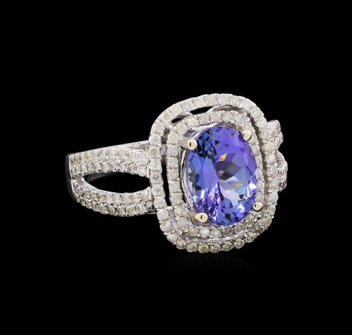 One electronically tested 14KT white gold ladies cast tanzanite and diamond ring with a bright polish finish. The featured tanzanite is set within two tiered diamond bezels supported by diamond set split shoulders, completed by a two and one-half millimeter wide band. Trademark is Orianne. Identified with markings of "14K". Condition is new, good workmanship. Containing: One prong set oval brilliant cut natural tanzanite, measuring 9.50 x 7.01 x 4.90mm, 6% bulge factor, approximate weight of 2.37ct., clarity is eye clean, type I, medium, very slightly grayish, bluish violet color, (GIA bV 5/3), cut is good. Transmitting light with no distortion, transparent. Graded in the setting. Tanzanite is a very rare gemstone that is only found in the country of Tanzania. Originally discovered in 1967. Tiffany & Company, named the stone Tanzanite. It is found in the Usumburu Mountains that border the Umba Valley of northern Tanzania. Tanzanite occurs in gray, brown, violet, blue, reddish-purple, & green. The gem is interesting because of its exceptional pleochroism. Rotated in different directions a tanzanite will exhibit multiple changes of color. Tanzanite has a low tolerance to ultrasonic cleaning, and should not be cleaned using this method. One Hundred Forty prong set round brilliant cut diamonds, measuring 1.20 - 1.10 x 0.69mm (depth est.) approximate total weight of 140 Stones = 0.87ct. Graded in the setting. Clarity: I-1 to I-3. Color: H - J. Total Weight of Colored Stones 2.37ct. Total Weight of Diamonds 0.87ct. Total Weight of Ring 5.95 grams. AIG Appraised.