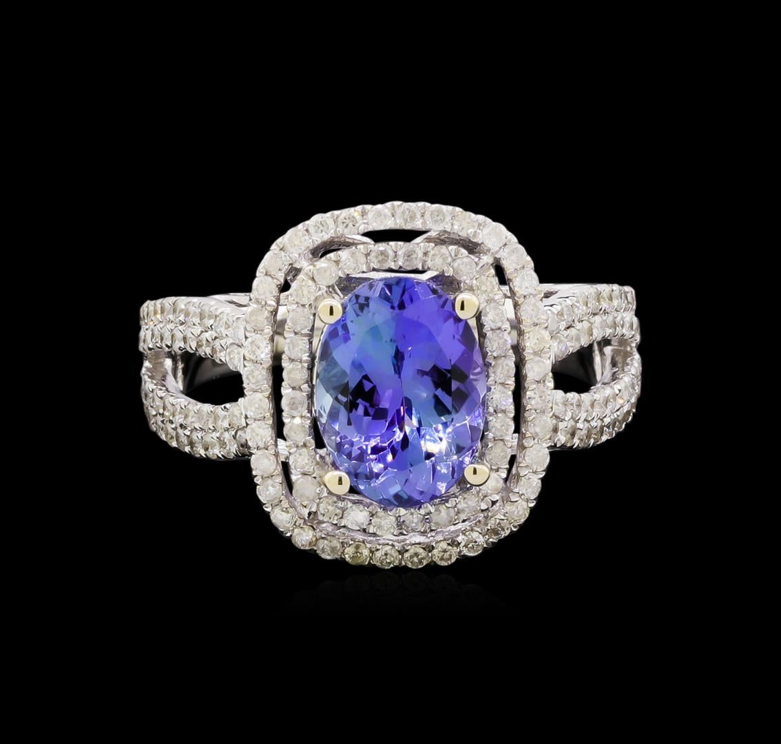 One electronically tested 14KT white gold ladies cast tanzanite and diamond ring with a bright polish finish. The featured tanzanite is set within two tiered diamond bezels supported by diamond set split shoulders, completed by a two and one-half millimeter wide band. Trademark is Orianne. Identified with markings of "14K". Condition is new, good workmanship. Containing: One prong set oval brilliant cut natural tanzanite, measuring 9.50 x 7.01 x 4.90mm, 6% bulge factor, approximate weight of 2.37ct., clarity is eye clean, type I, medium, very slightly grayish, bluish violet color, (GIA bV 5/3), cut is good. Transmitting light with no distortion, transparent. Graded in the setting. Tanzanite is a very rare gemstone that is only found in the country of Tanzania. Originally discovered in 1967. Tiffany & Company, named the stone Tanzanite. It is found in the Usumburu Mountains that border the Umba Valley of northern Tanzania. Tanzanite occurs in gray, brown, violet, blue, reddish-purple, & green. The gem is interesting because of its exceptional pleochroism. Rotated in different directions a tanzanite will exhibit multiple changes of color. Tanzanite has a low tolerance to ultrasonic cleaning, and should not be cleaned using this method. One Hundred Forty prong set round brilliant cut diamonds, measuring 1.20 - 1.10 x 0.69mm (depth est.) approximate total weight of 140 Stones = 0.87ct. Graded in the setting. Clarity: I-1 to I-3. Color: H - J. Total Weight of Colored Stones 2.37ct. Total Weight of Diamonds 0.87ct. Total Weight of Ring 5.95 grams. AIG Appraised.
