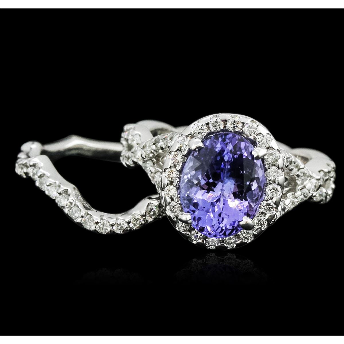 One electronically tested 14KT white gold ladies cast tanzanite and diamond ring and guard with a bright polish finish. Identified with markings of "14K". Condition is new. Containing: One prong set oval modified brilliant cut natural tanzanite, measuring 10.01 x 7.89 x 4.27mm, approximate weight of 2.37ct., clarity is eye clean, type I, medium light, very slightly grayish, violet color, (GIA V 4/3), cut is good. Forty-Six prong set round brilliant cut diamonds, measuring 1.50 - 1.50 x 0.90mm (depth est.) approximate total weight of 46 Stones = 0.57ct. Clarity: SI-2 to I-1. Color: I - J, Cut is Good. Colored gemstones are presumed to have been subjected to commonly used enhancement processes. All diamonds and colored gemstones are graded in the mounting, unless otherwise stated. Total Weight of Colored Stones 2.37ct. Total Weight of Diamonds 0.57ct. Total Weight of Ring and Guard 6.90 grams. GGL Appraised at $4,585.00.