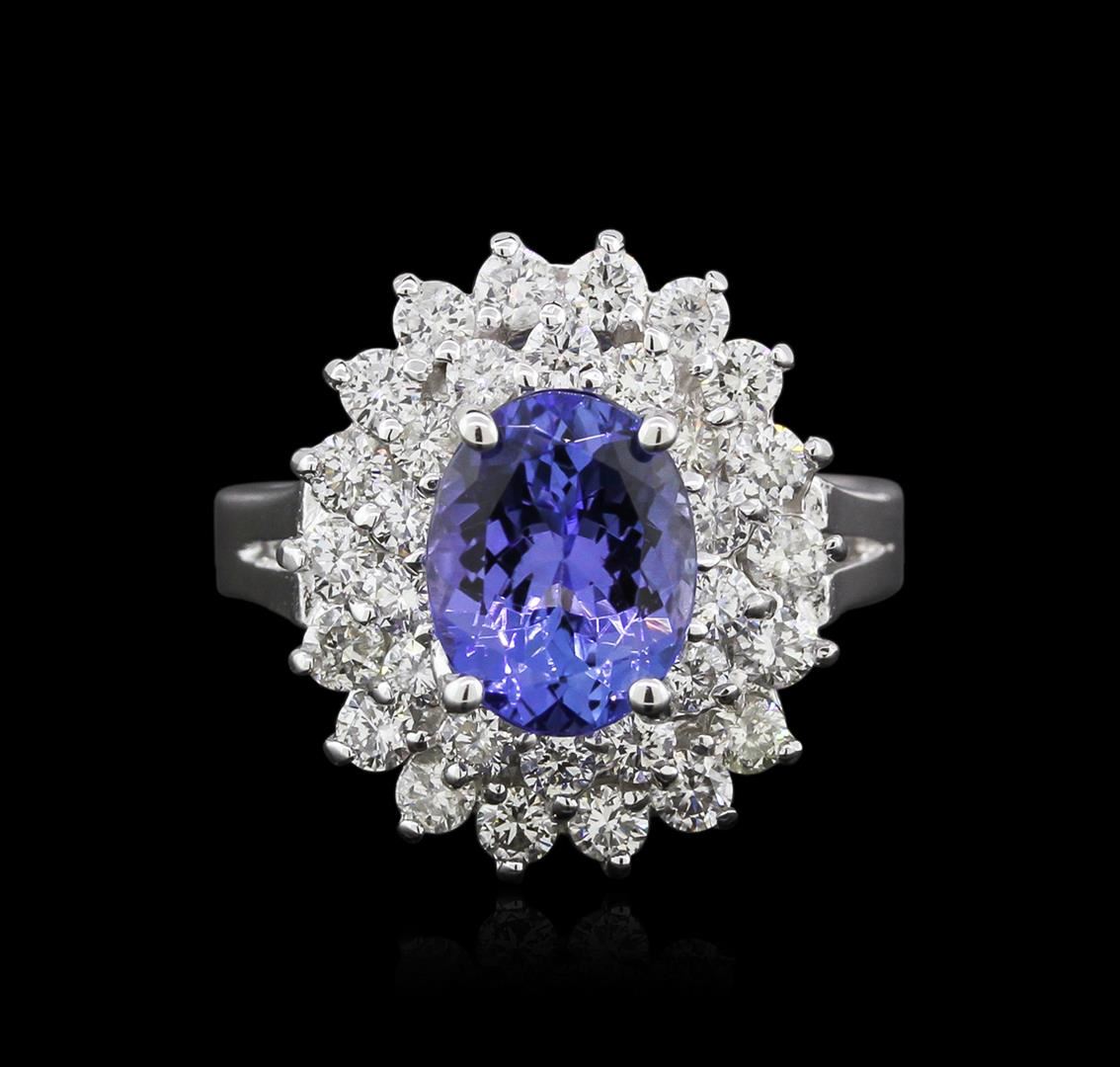 One electronically tested 14KT white gold ladies cast tanzanite and diamond ring with a bright polish finish. Identified with markings of "14K". Condition is new. Containing: One prong set oval modified brilliant cut natural tanzanite, measuring 8.90 x 7.00 x 4.55mm, approximate weight of 2.37ct., clarity is eye clean, type I, medium, moderately strong, violet color, (GIA V 5/4), cut is good. Thirty-Two prong set round brilliant cut diamonds, measuring 2.00 - 1.90 x 1.17mm (depth est.) approximate total weight of 32 Stones = 1.09ct. Clarity: SI-2 to I-1. Color: I - J, Cut is Good. Colored gemstones are presumed to have been subjected to commonly used enhancement processes. All diamonds and colored gemstones are graded in the mounting, unless otherwise stated. Total Weight of Colored Stones 2.37ct. Total Weight of Diamonds 1.09ct. Total Weight of Ring 5.70 grams. GGL Appraised at $4,210.00.