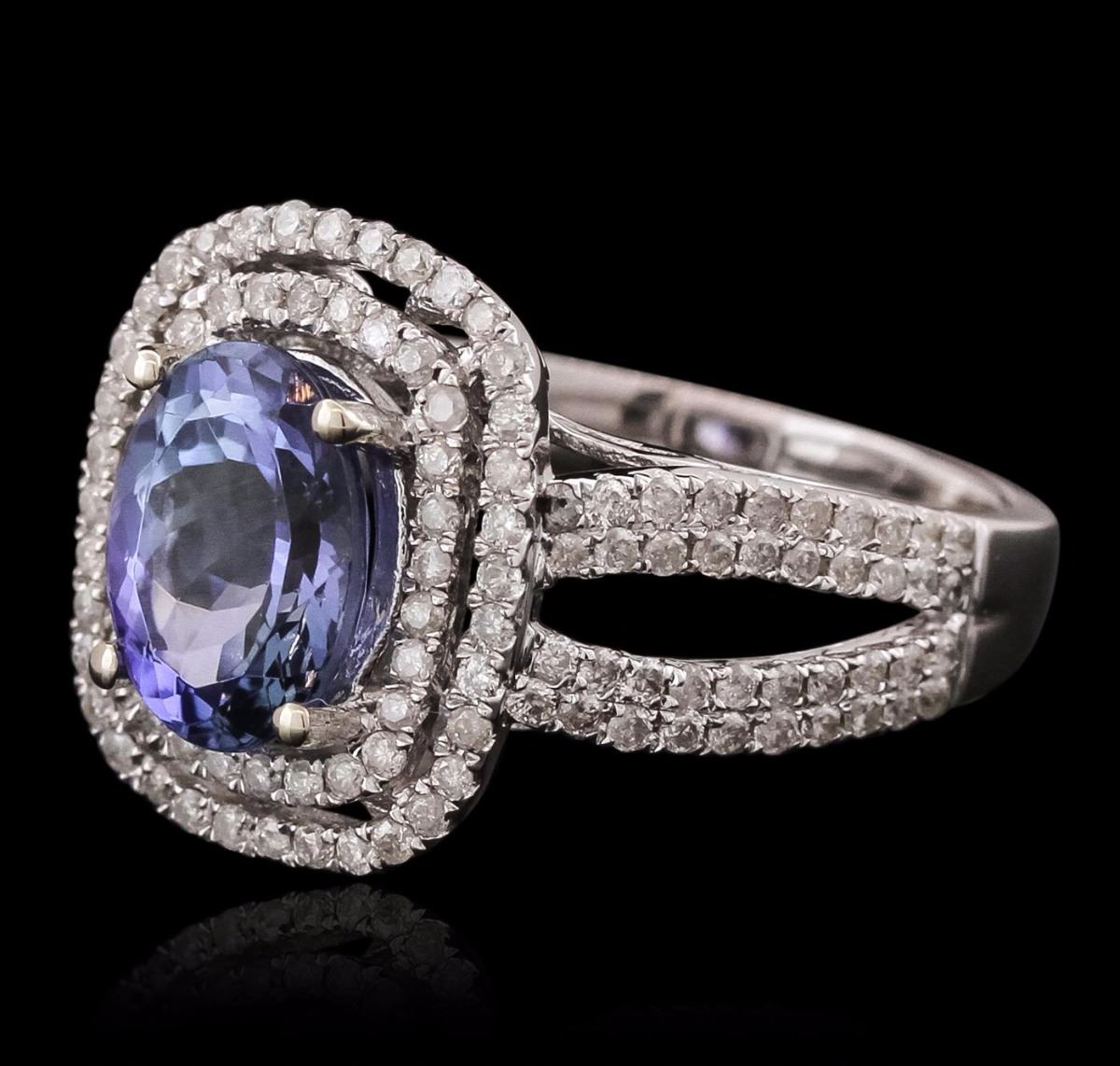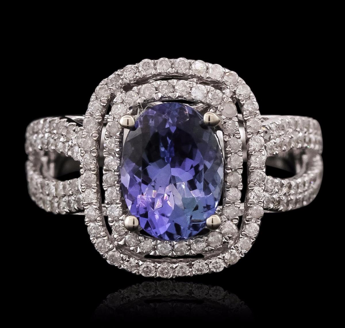 One electronically tested 14KT white gold ladies cast tanzanite and diamond ring with a bright polish finish. The featured tanzanite is set within two tiered diamond bezels supported by diamond set split shoulders, completed by a two and one-half millimeter wide band. Trademark is Orianne. Identified with markings of "14K". Condition is new, good workmanship. Containing: One prong set oval brilliant cut natural tanzanite, measuring 9.50 x 7.01 x 4.90mm, 6% bulge factor, approximate weight of 2.37ct., clarity is eye clean, type I, medium, very slightly grayish, bluish violet color, (GIA bV 5/3), cut is good. Transmitting light with no distortion, transparent. Graded in the setting. Tanzanite is a very rare gemstone that is only found in the country of Tanzania. Originally discovered in 1967. Tiffany & Company, named the stone Tanzanite. It is found in the Usumburu Mountains that border the Umba Valley of northern Tanzania. Tanzanite occurs in gray, brown, violet, blue, reddish-purple, & green. The gem is interesting because of its exceptional pleochroism. Rotated in different directions a tanzanite will exhibit multiple changes of color. Tanzanite has a low tolerance to ultrasonic cleaning, and should not be cleaned using this method. One Hundred Forty prong set round brilliant cut diamonds, measuring 1.20 - 1.10 x 0.69mm (depth est.) approximate total weight of 140 Stones = 0.87ct. Graded in the setting. Clarity: I-1 to I-3. Color: H - J. Total Weight of Colored Stones 2.37ct. Total Weight of Diamonds 0.87ct. Total Weight of Ring 5.95 grams. AIG Appraised at $8,340.00.