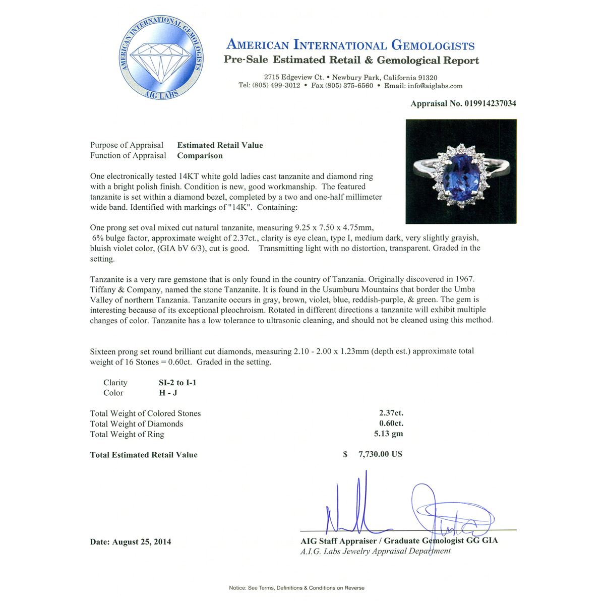 One electronically tested 14KT white gold ladies cast tanzanite and diamond ring with a bright polish finish. The featured tanzanite is set within a diamond bezel, completed by a two and one-half millimeter wide band. Identified with markings of "14K". Condition is new, good workmanship. Containing: One prong set oval mixed cut natural tanzanite, measuring 9.25 x 7.50 x 4.75mm, 6% bulge factor, approximate weight of 2.37ct., clarity is eye clean, type I, medium dark, very slightly grayish, bluish violet color, (GIA bV 6/3), cut is good. Transmitting light with no distortion, transparent. Graded in the setting. Tanzanite is a very rare gemstone that is only found in the country of Tanzania. Originally discovered in 1967. Tiffany & Company, named the stone Tanzanite. It is found in the Usumburu Mountains that border the Umba Valley of northern Tanzania. Tanzanite occurs in gray, brown, violet, blue, reddish-purple, & green. The gem is interesting because of its exceptional pleochroism. Rotated in different directions a tanzanite will exhibit multiple changes of color. Tanzanite has a low tolerance to ultrasonic cleaning, and should not be cleaned using this method. Sixteen prong set round brilliant cut diamonds, measuring 2.10 - 2.00 x 1.23mm (depth est.) approximate total weight of 16 Stones = 0.60ct. Graded in the setting. Clarity: SI-2 to I-1. Color: H - J. Total Weight of Colored Stones 2.37ct. Total Weight of Diamonds 0.60ct. Total Weight of Ring 5.13 grams. AIG Appraised at $7,730.00.