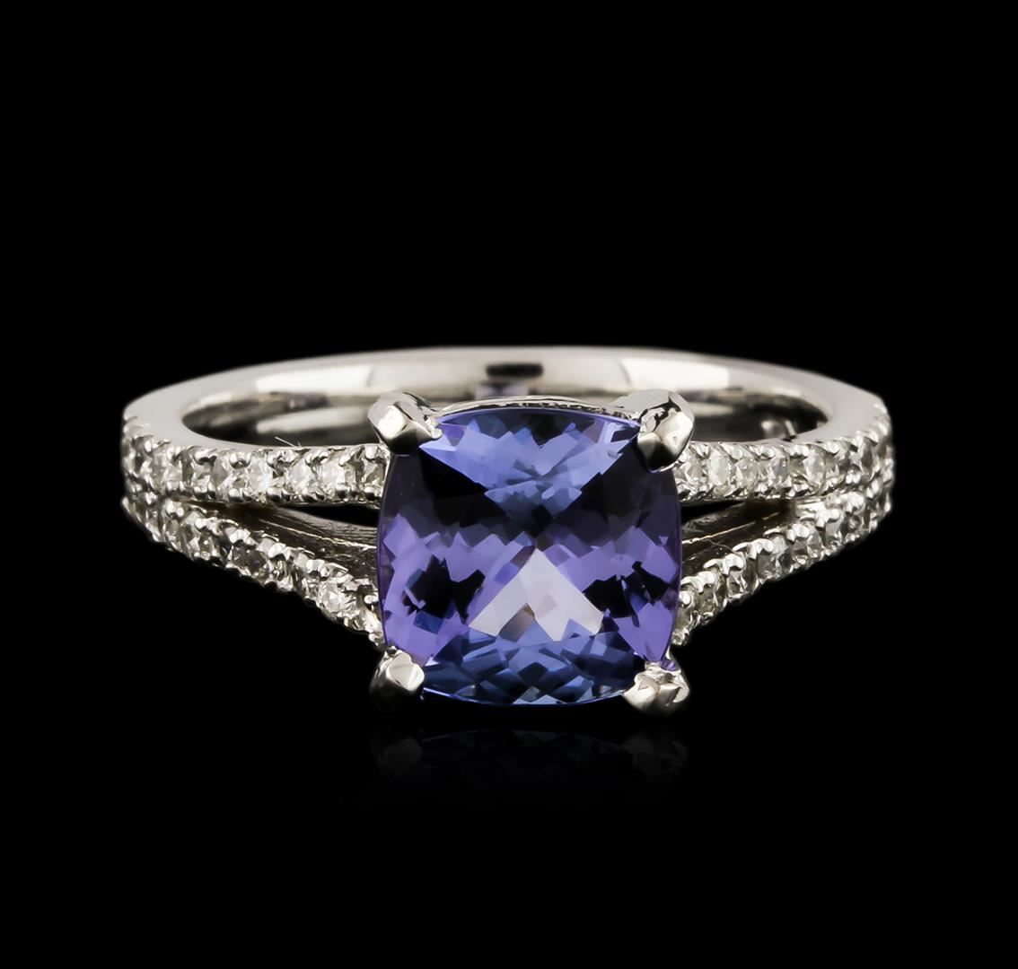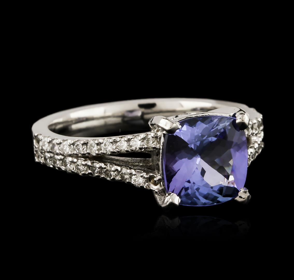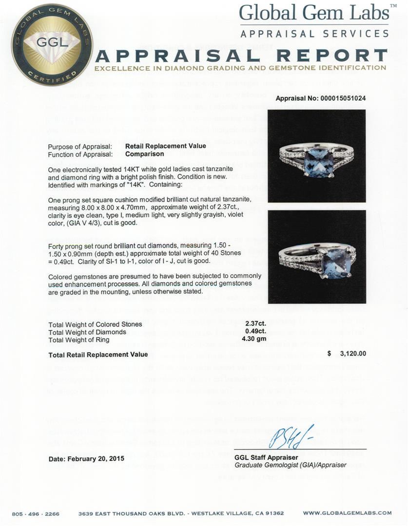 One electronically tested 14KT white gold ladies cast tanzanite and diamond ring with a bright polish finish. Identified with markings of "14K". Condition is new. Containing: One prong set square cushion modified brilliant cut natural tanzanite, measuring 8.00 x 8.00 x 4.70mm, approximate weight of 2.37ct., clarity is eye clean, type I, medium light, very slightly grayish, violet color, (GIA V 4/3), cut is good. Forty prong set round brilliant cut diamonds, measuring 1.50 - 1.50 x 0.90mm (depth est.) approximate total weight of 40 Stones = 0.49ct. Clarity: SI-1 to I-1. Color: I - J, Cut is Good. Colored gemstones are presumed to have been subjected to commonly used enhancement processes. All diamonds and colored gemstones are graded in the mounting, unless otherwise stated. Total Weight of Colored Stones 2.37ct. Total Weight of Diamonds 0.49ct. Total Weight of Ring 4.30 grams. GGL Appraised at $3,120.00.