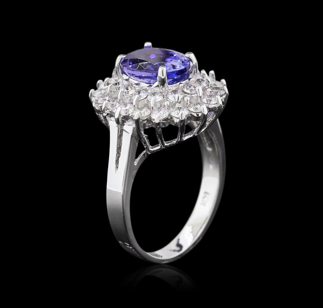 One electronically tested 14KT white gold ladies cast tanzanite and diamond ring with a bright polish finish. Identified with markings of "14K". Condition is new. Containing: One prong set oval modified brilliant cut natural tanzanite, measuring 8.90 x 7.00 x 4.55mm, approximate weight of 2.37ct., clarity is eye clean, type I, medium, moderately strong, violet color, (GIA V 5/4), cut is good. Thirty-Two prong set round brilliant cut diamonds, measuring 2.00 - 1.90 x 1.17mm (depth est.) approximate total weight of 32 Stones = 1.09ct. Clarity: SI-2 to I-1. Color: I - J, Cut is Good. Colored gemstones are presumed to have been subjected to commonly used enhancement processes. All diamonds and colored gemstones are graded in the mounting, unless otherwise stated. Total Weight of Colored Stones 2.37ct. Total Weight of Diamonds 1.09ct. Total Weight of Ring 5.70 grams. GGL Appraised at $4,210.00.