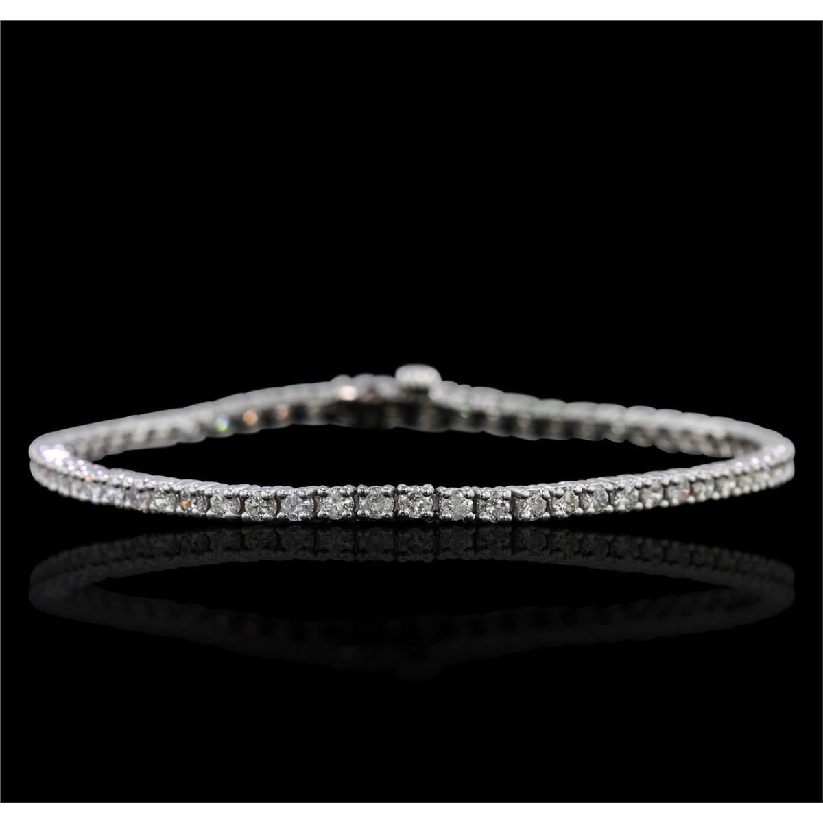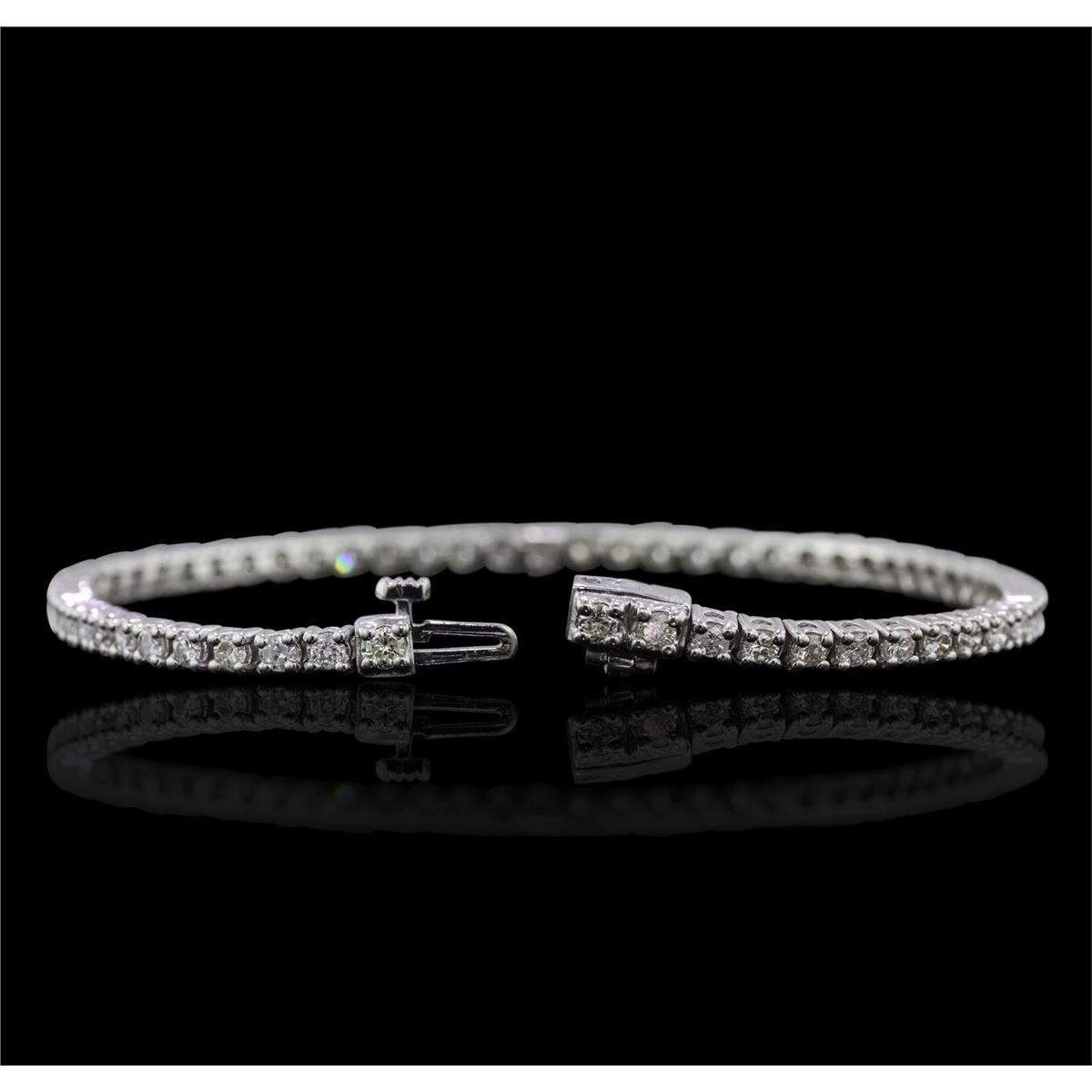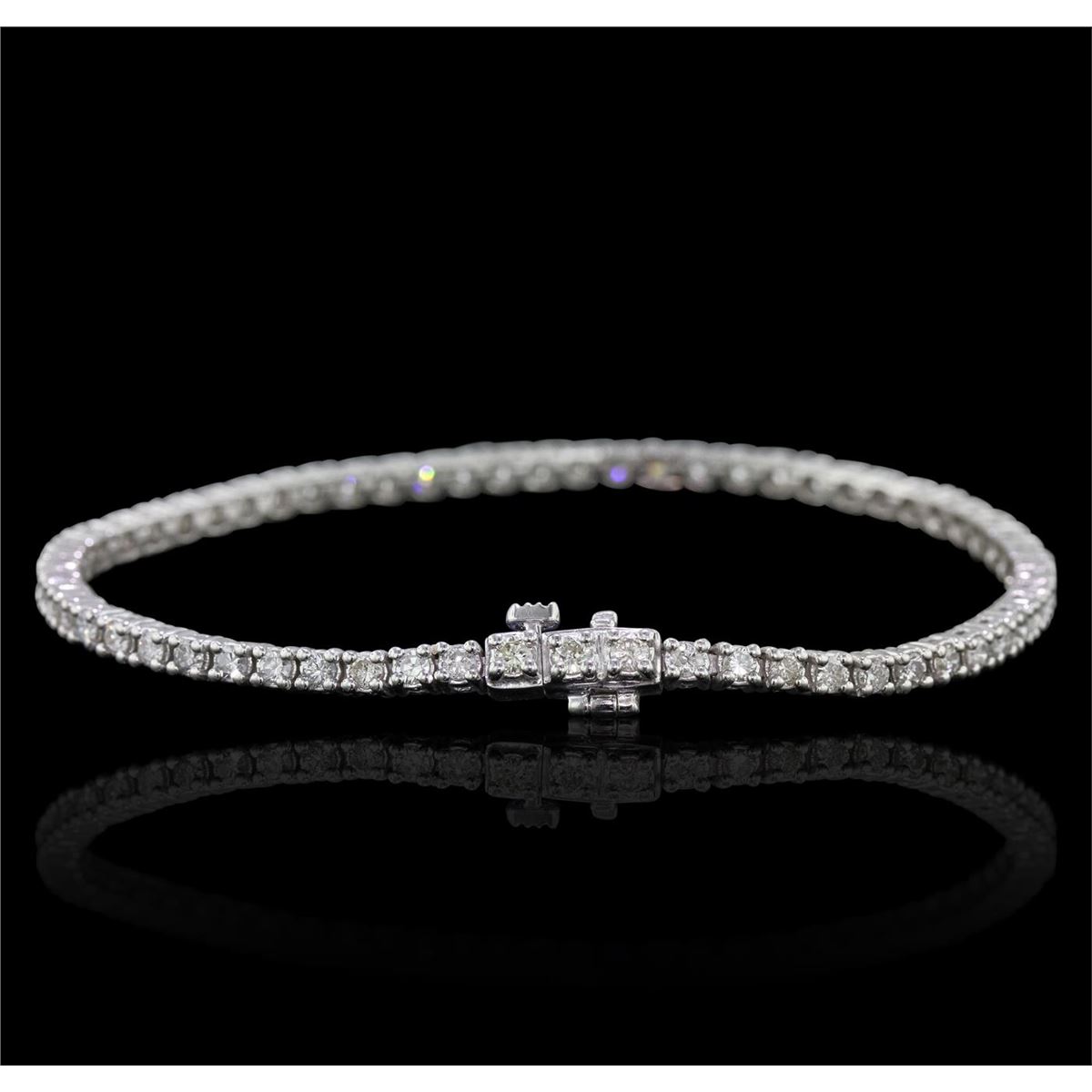 One electronically tested 14KT white gold Ladies combination cast & assembled tennis bracelet with a hidden box clasp with a bright polish finish. Condition is new. Measurements: 7" in length. Identified with markings of "14K". Containing: Sixty-One prong set round brilliant cut diamonds, measuring 2.20 - 2.20 x 1.32mm (depth est.) approximate. Total Weight of 61 Stones = 2.37ct. Clarity: I-1 to I-3. Color: I - J, Cut is Good. Total Weight of Diamonds 2.37ct. Total Weight of Bracelet 10.80 grams. GGL Appraised at $7,210.00.