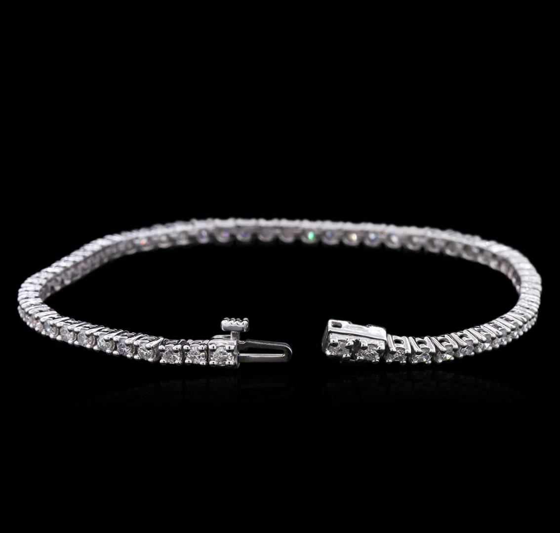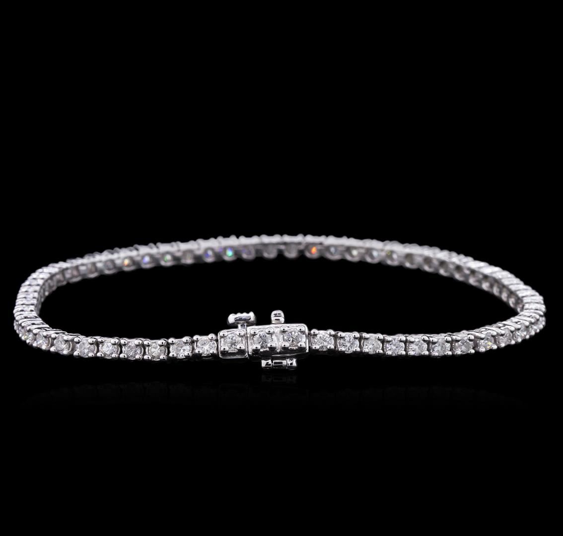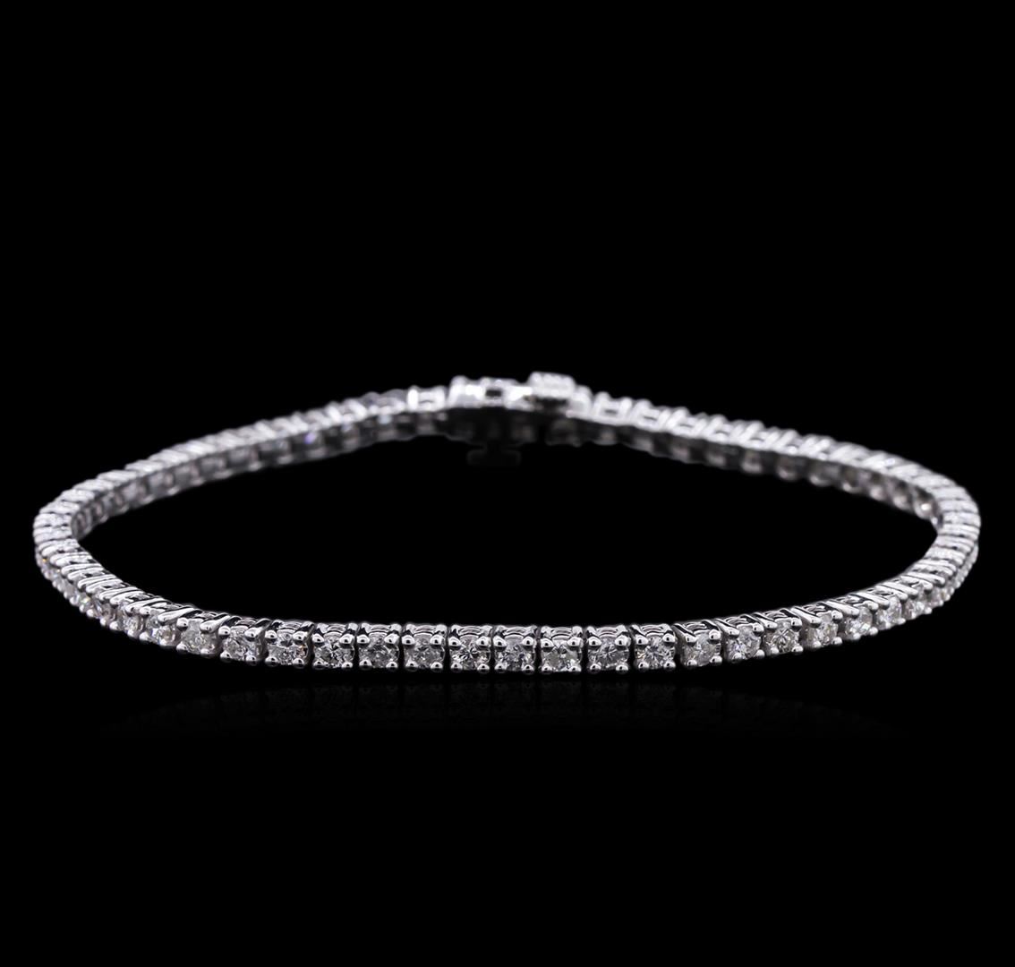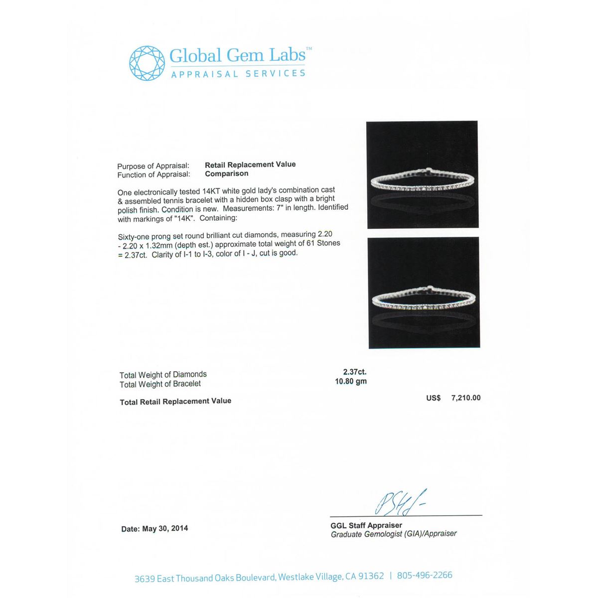 One electronically tested 14KT white gold Ladies combination cast & assembled tennis bracelet with a hidden box clasp with a bright polish finish. Condition is new. Measurements: 7" in length. Identified with markings of "14K". Containing: Sixty-One prong set round brilliant cut diamonds, measuring 2.20 - 2.20 x 1.32mm (depth est.) approximate. Total Weight of 61 Stones = 2.37ct. Clarity: I-1 to I-3. Color: I - J, Cut is Good. Total Weight of Diamonds 2.37ct. Total Weight of Bracelet 10.80 grams. GGL Appraised at $7,210.00.