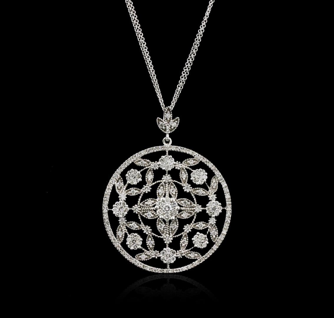 One electronically tested 14KT white gold ladies combination cast & assembled diamond pendant & chain 16.0" long, thin oval cable link with a lobster claw clasp with a bright polish finish. Identified with markings of "14K". Condition is new. Containing: Nine prong set round brilliant cut diamonds, measuring 2.50 - 2.00 x 1.35mm (depth est.) approximate total weight of 9 Stones = 0.37ct. Clarity of I-1 to I-3, Color of I - J. One Hundred Sixty-Three prong set round brilliant cut diamonds, measuring 1.50 - 1.50 x 0.90mm (depth est.) approximate total weight of 163 Stones = 2.01ct. Clarity of SI-2 to I-2, Color of I - J. All diamonds are graded in the mounting, unless otherwise stated. Total Weight of Diamonds 2.38ct. Total Weight of Pendant & Chain 15.60 grams. GGL Appraised at $6,555.00.
