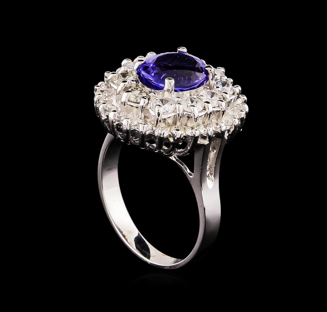 One electronically tested 14KT white gold Ladies cast ring with a bright polish finish. Condition is new. Identified with markings of "14K". Containing: One prong set oval modified brilliant cut natural tanzanite, measuring 9.10 x 7.50 x 5.15mm, approximate weight of 2.38ct., clarity is eye clean, type I, medium, moderately strong, violet color, (GIA V 5/4), cut is good. Colored gemstones are presumed to have been subjected to commonly used color/clarity enhancement processes. Twenty-Six prong set round brilliant cut diamonds, measuring 1.90 - 1.90 x 1.14mm (depth est.) approximate. Total Weight of 26 Stones = 0.65ct. Clarity: I-1 to I-2. Color: H - I, Cut is Good. All grading of diamonds and colored gemstones in this piece of jewelry are graded in the mounting, unless otherwise stated. Ten prong set round brilliant cut diamonds, measuring 2.90 - 2.90 x 1.74mm (depth est.) approximate. Total Weight of 10 Stones = 0.89ct. Clarity: SI-2 to I-1. Color: I - J, Cut is Good. All grading of diamonds and colored gemstones in this piece of jewelry are graded in the mounting, unless otherwise stated. Total Weight of Colored Stones 2.38ct. Total Weight of Diamonds 1.55ct. Total Weight of Ring 8.40 grams. GGL Appraised at $9,465.00.