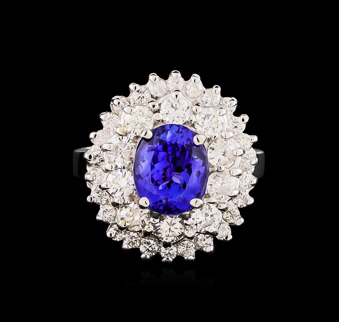 One electronically tested 14KT white gold Ladies cast ring with a bright polish finish. Condition is new. Identified with markings of "14K". Containing: One prong set oval modified brilliant cut natural tanzanite, measuring 9.10 x 7.50 x 5.15mm, approximate weight of 2.38ct., clarity is eye clean, type I, medium, moderately strong, violet color, (GIA V 5/4), cut is good. Colored gemstones are presumed to have been subjected to commonly used color/clarity enhancement processes. Twenty-Six prong set round brilliant cut diamonds, measuring 1.90 - 1.90 x 1.14mm (depth est.) approximate. Total Weight of 26 Stones = 0.65ct. Clarity: I-1 to I-2. Color: H - I, Cut is Good. All grading of diamonds and colored gemstones in this piece of jewelry are graded in the mounting, unless otherwise stated. Ten prong set round brilliant cut diamonds, measuring 2.90 - 2.90 x 1.74mm (depth est.) approximate. Total Weight of 10 Stones = 0.89ct. Clarity: SI-2 to I-1. Color: I - J, Cut is Good. All grading of diamonds and colored gemstones in this piece of jewelry are graded in the mounting, unless otherwise stated. Total Weight of Colored Stones 2.38ct. Total Weight of Diamonds 1.55ct. Total Weight of Ring 8.40 grams. GGL Appraised.