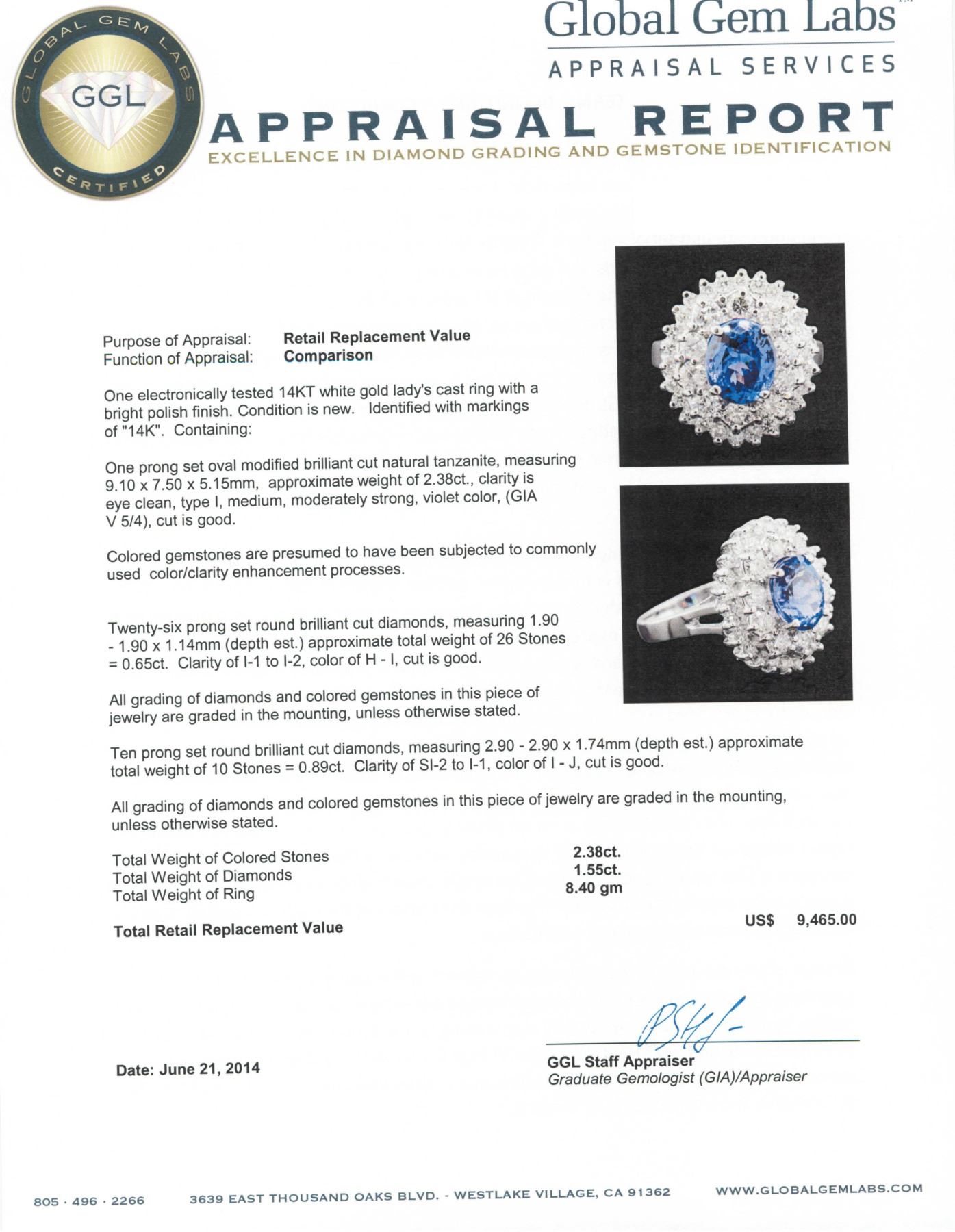 One electronically tested 14KT white gold Ladies cast ring with a bright polish finish. Condition is new. Identified with markings of "14K". Containing: One prong set oval modified brilliant cut natural tanzanite, measuring 9.10 x 7.50 x 5.15mm, approximate weight of 2.38ct., clarity is eye clean, type I, medium, moderately strong, violet color, (GIA V 5/4), cut is good. Colored gemstones are presumed to have been subjected to commonly used color/clarity enhancement processes. Twenty-Six prong set round brilliant cut diamonds, measuring 1.90 - 1.90 x 1.14mm (depth est.) approximate. Total Weight of 26 Stones = 0.65ct. Clarity: I-1 to I-2. Color: H - I, Cut is Good. All grading of diamonds and colored gemstones in this piece of jewelry are graded in the mounting, unless otherwise stated. Ten prong set round brilliant cut diamonds, measuring 2.90 - 2.90 x 1.74mm (depth est.) approximate. Total Weight of 10 Stones = 0.89ct. Clarity: SI-2 to I-1. Color: I - J, Cut is Good. All grading of diamonds and colored gemstones in this piece of jewelry are graded in the mounting, unless otherwise stated. Total Weight of Colored Stones 2.38ct. Total Weight of Diamonds 1.55ct. Total Weight of Ring 8.40 grams. GGL Appraised.