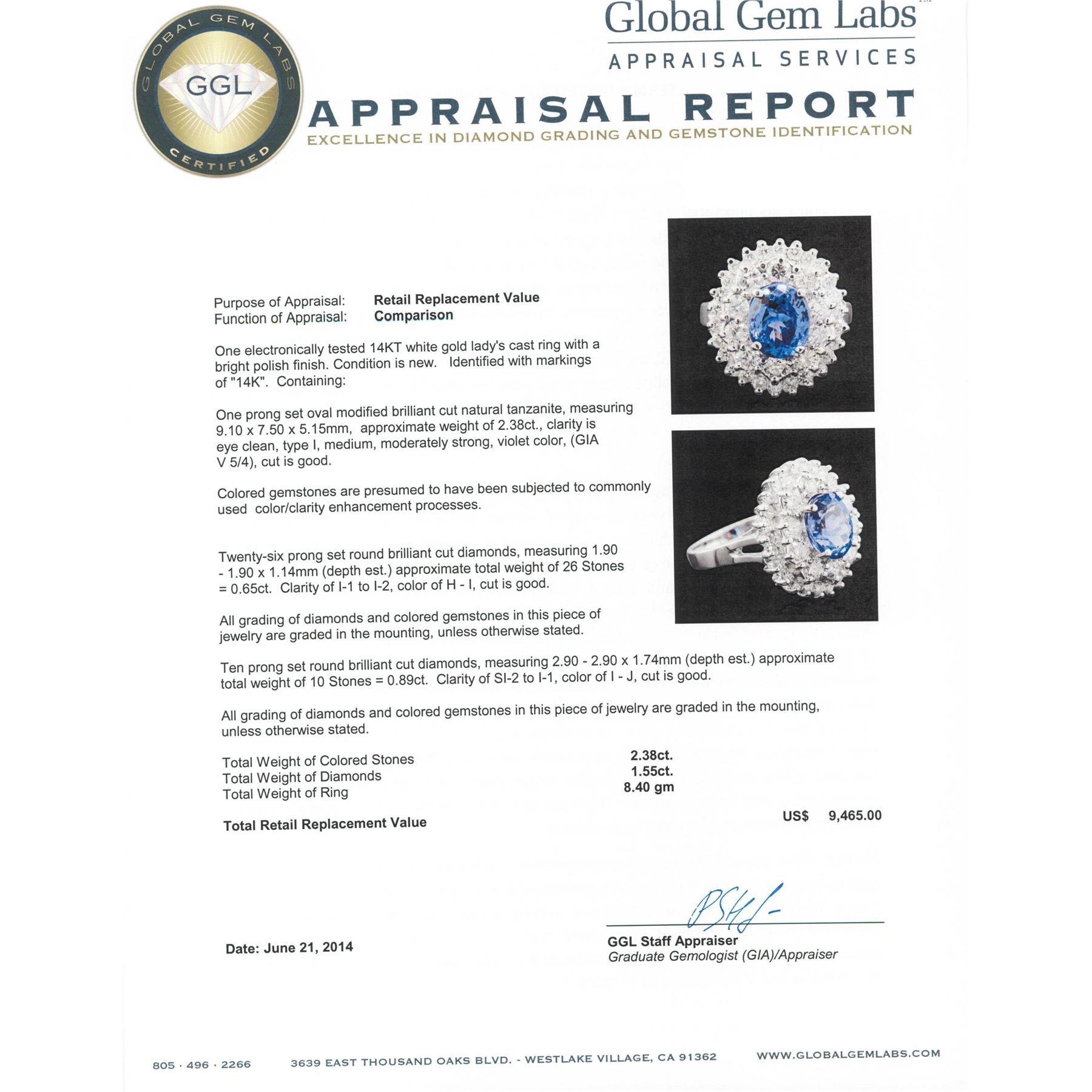 One electronically tested 14KT white gold Ladies cast ring with a bright polish finish. Condition is new. Identified with markings of "14K". Containing: One prong set oval modified brilliant cut natural tanzanite, measuring 9.10 x 7.50 x 5.15mm, approximate weight of 2.38ct., clarity is eye clean, type I, medium, moderately strong, violet color, (GIA V 5/4), cut is good. Colored gemstones are presumed to have been subjected to commonly used color/clarity enhancement processes. Twenty-Six prong set round brilliant cut diamonds, measuring 1.90 - 1.90 x 1.14mm (depth est.) approximate. Total Weight of 26 Stones = 0.65ct. Clarity: I-1 to I-2. Color: H - I, Cut is Good. All grading of diamonds and colored gemstones in this piece of jewelry are graded in the mounting, unless otherwise stated. Ten prong set round brilliant cut diamonds, measuring 2.90 - 2.90 x 1.74mm (depth est.) approximate. Total Weight of 10 Stones = 0.89ct. Clarity: SI-2 to I-1. Color: I - J, Cut is Good. All grading of diamonds and colored gemstones in this piece of jewelry are graded in the mounting, unless otherwise stated. Total Weight of Colored Stones 2.38ct. Total Weight of Diamonds 1.55ct. Total Weight of Ring 8.40 grams. GGL Appraised.