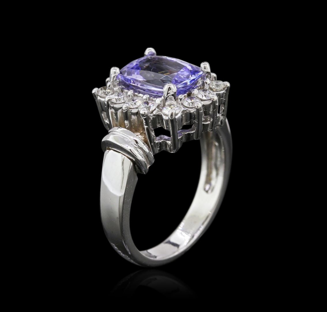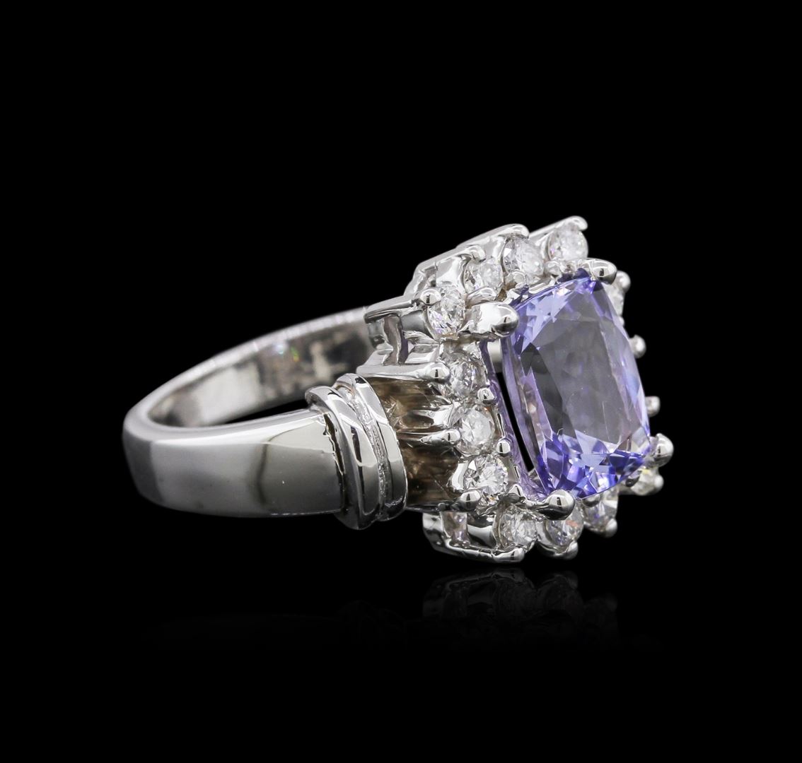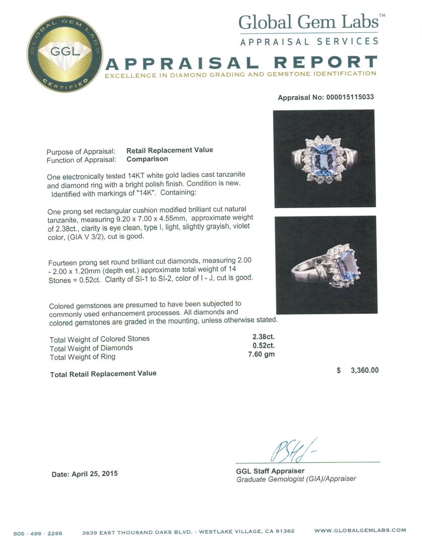 One electronically tested 14KT white gold ladies cast tanzanite and diamond ring with a bright polish finish. Identified with markings of "14K". Condition is new. Containing: One prong set rectangular cushion modified brilliant cut natural tanzanite, measuring 9.20 x 7.00 x 4.55mm, approximate weight of 2.38ct., clarity is eye clean, type I, light, slightly grayish, violet color, (GIA V 3/2), cut is good. Fourteen prong set round brilliant cut diamonds, measuring 2.00 - 2.00 x 1.20mm (depth est.) approximate total weight of 14 Stones = 0.52ct. Clarity: SI-1 to SI-2. Color: I - J, Cut is Good. Colored gemstones are presumed to have been subjected to commonly used enhancement processes. All diamonds and colored gemstones are graded in the mounting, unless otherwise stated. Total Weight of Colored Stones 2.38ct. Total Weight of Diamonds 0.52ct. Total Weight of Ring 7.60 grams. GGL Appraised at $3,360.00.