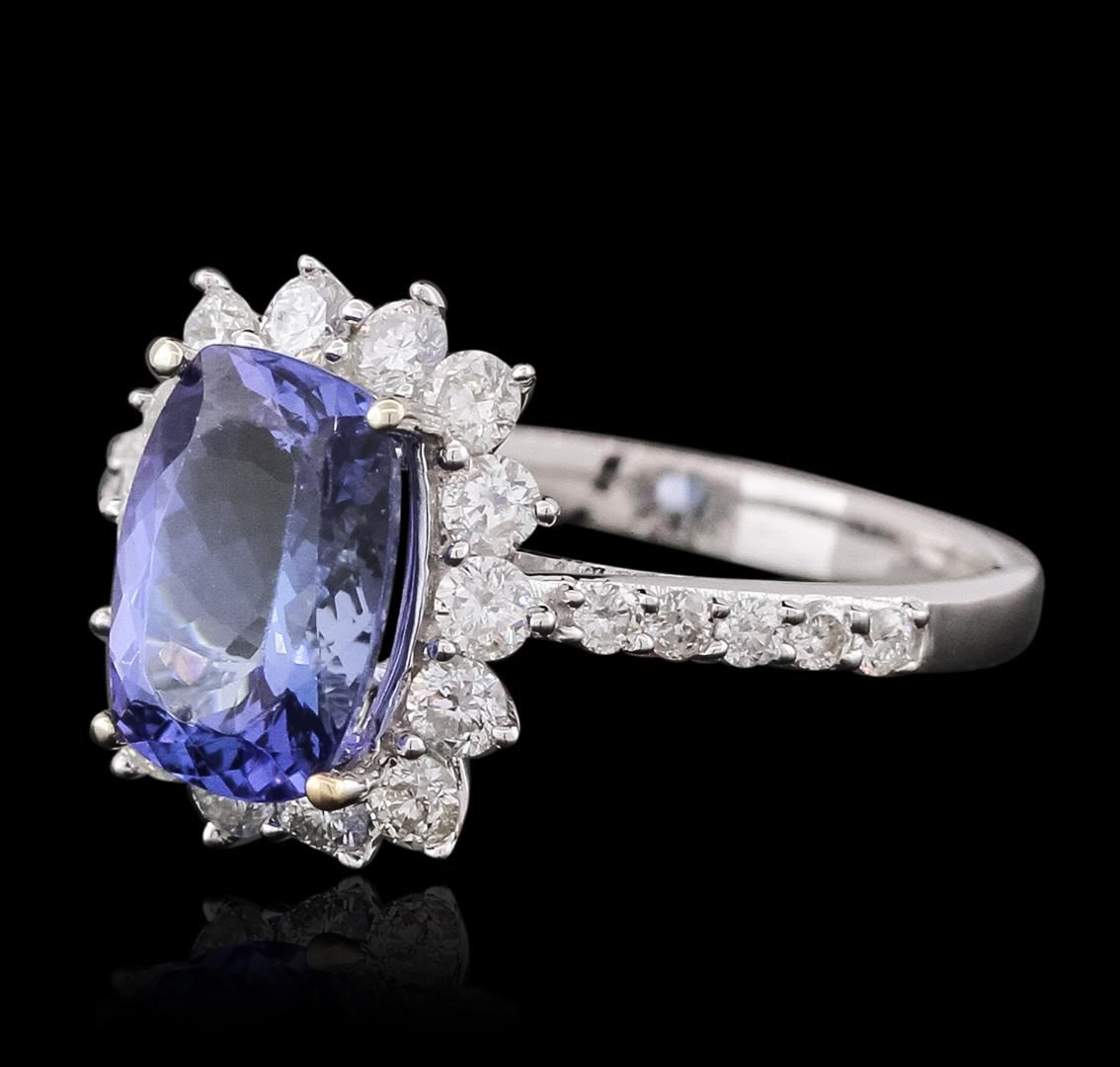 One electronically tested 14KT white gold ladies combination cast & assembled tanzanite and diamond ring with a flat shank with a bright polish finish. Identified with markings of "14K". Condition is new. Containing: One prong set rectangular cushion modified brilliant cut natural tanzanite, measuring 9.79 x 7.02 x 4.39mm, approximate weight of 2.38ct., clarity is eye clean, type I, medium light, moderately strong, violet color, (GIA V 4/4), cut is good. Twenty-Three prong set round brilliant cut diamonds, measuring 2.30 - 1.50 x 1.14mm (depth est.) approximate total weight of 23 Stones = 0.58ct. Clarity: SI-2 to I-2. Color: I - J, Cut is Good. Colored gemstones are presumed to have been subjected to commonly used enhancement processes. All diamonds and colored gemstones are graded in the mounting, unless otherwise stated. Total Weight of Colored Stones 2.38ct. Total Weight of Diamonds 0.58ct. Total Weight of Ring 3.30 grams. GGL Appraised at $5,665.00.