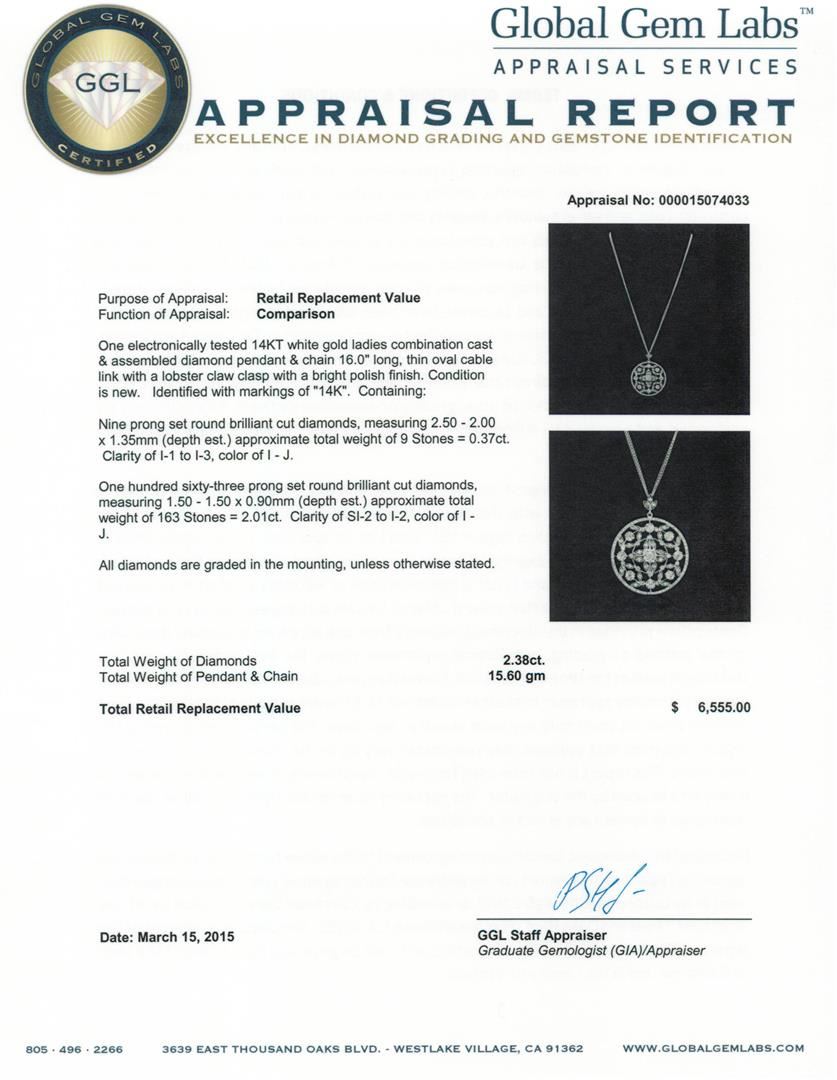 One electronically tested 14KT white gold ladies combination cast & assembled diamond pendant & chain 16.0" long, thin oval cable link with a lobster claw clasp with a bright polish finish. Identified with markings of "14K". Condition is new. Containing: Nine prong set round brilliant cut diamonds, measuring 2.50 - 2.00 x 1.35mm (depth est.) approximate total weight of 9 Stones = 0.37ct. Clarity of I-1 to I-3, Color of I - J. One Hundred Sixty-Three prong set round brilliant cut diamonds, measuring 1.50 - 1.50 x 0.90mm (depth est.) approximate total weight of 163 Stones = 2.01ct. Clarity of SI-2 to I-2, Color of I - J. All diamonds are graded in the mounting, unless otherwise stated. Total Weight of Diamonds 2.38ct. Total Weight of Pendant & Chain 15.60 grams. GGL Appraised at $6,555.00.