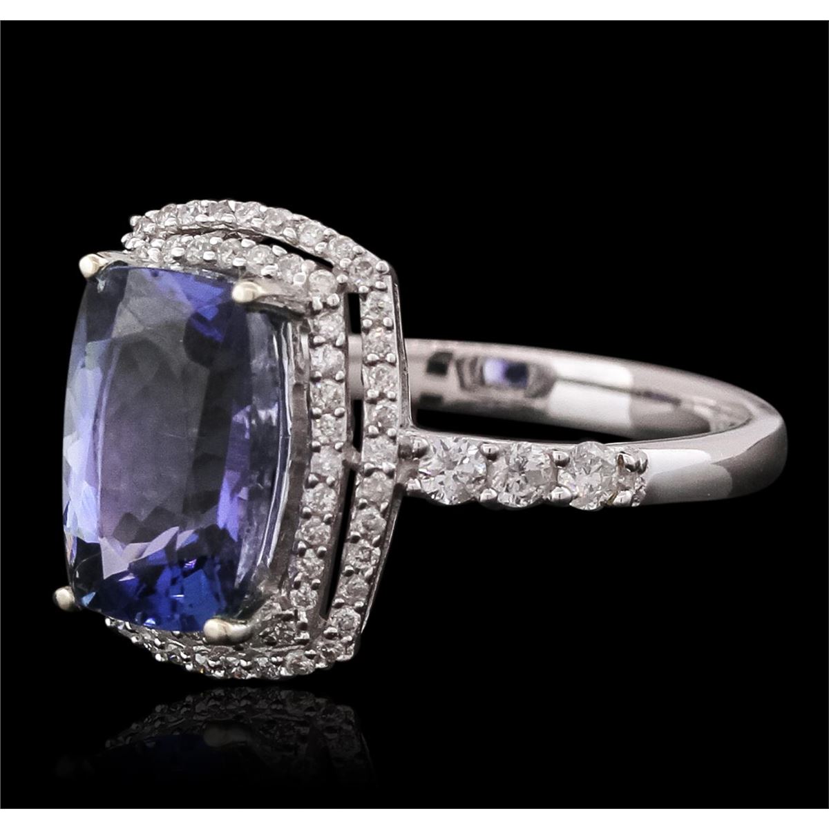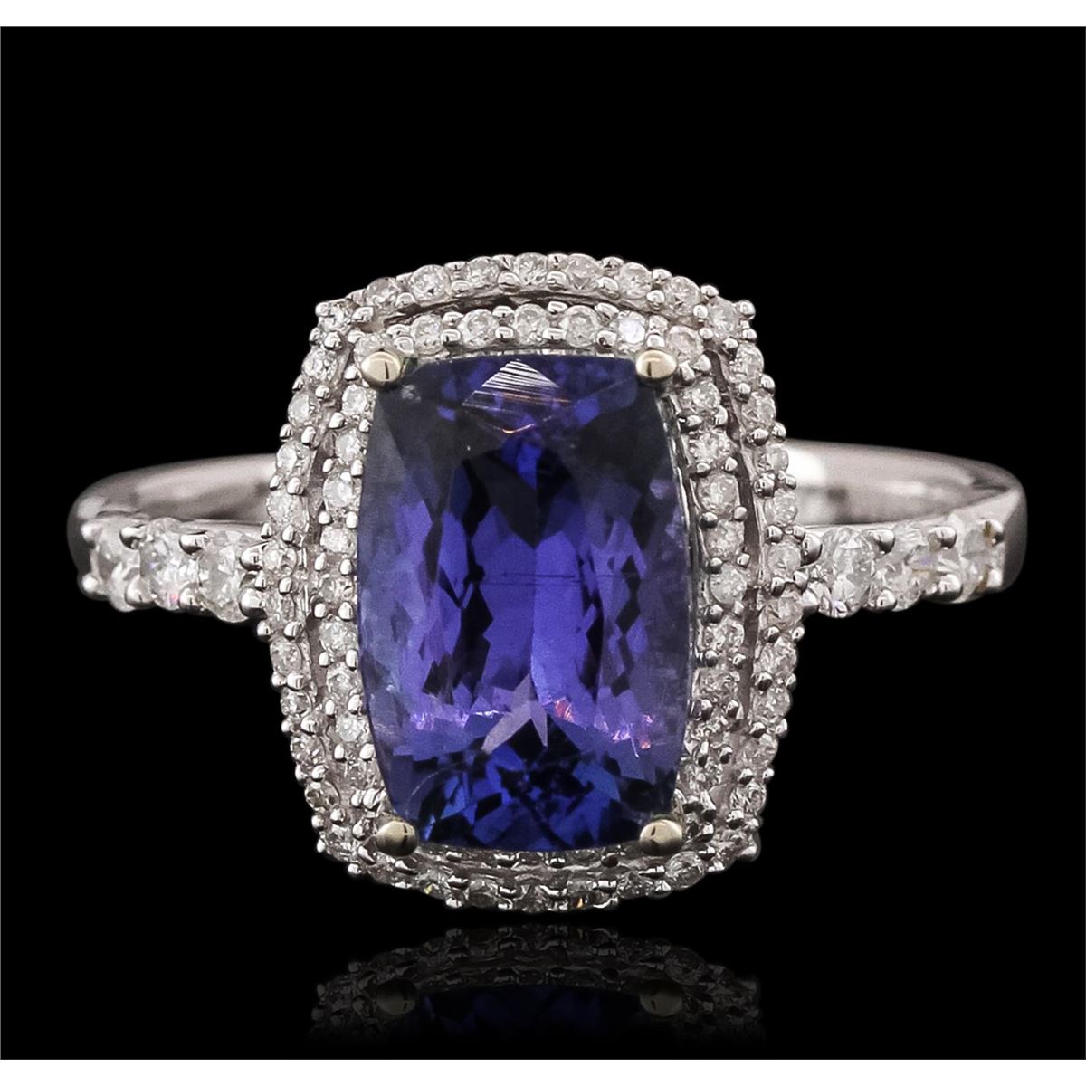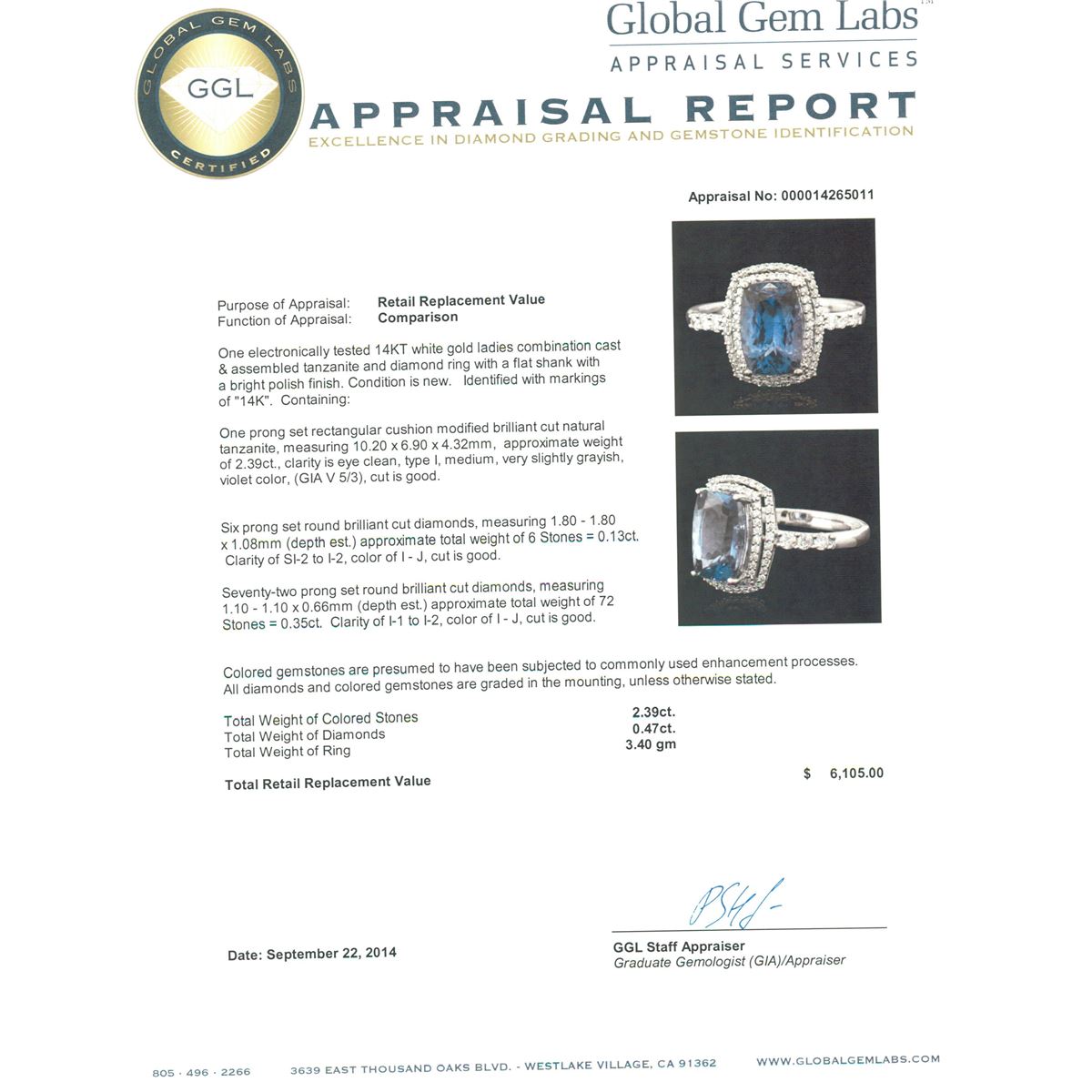 One electronically tested 14KT white gold ladies combination cast & assembled tanzanite and diamond ring with a flat shank with a bright polish finish. Identified with markings of "14K". Condition is new. Containing: One prong set rectangular cushion modified brilliant cut natural tanzanite, measuring 10.20 x 6.90 x 4.32mm, approximate weight of 2.39ct., clarity is eye clean, type I, medium, very slightly grayish, violet color, (GIA V 5/3), cut is good. Six prong set round brilliant cut diamonds, measuring 1.80 - 1.80 x 1.08mm (depth est.) approximate total weight of 6 Stones = 0.13ct. Clarity: SI-2 to I-2. Color: I - J, Cut is Good. Seventy-Two prong set round brilliant cut diamonds, measuring 1.10 - 1.10 x 0.66mm (depth est.) approximate total weight of 72 Stones = 0.35ct. Clarity: I-1 to I-2. Color: I - J, Cut is Good. Colored gemstones are presumed to have been subjected to commonly used enhancement processes. All diamonds and colored gemstones are graded in the mounting, unless otherwise stated. Total Weight of Colored Stones 2.39ct. Total Weight of Diamonds 0.47ct. Total Weight of Ring 3.40 grams. GGL Appraised at $6,105.00.
