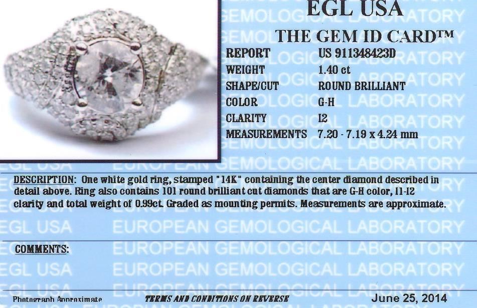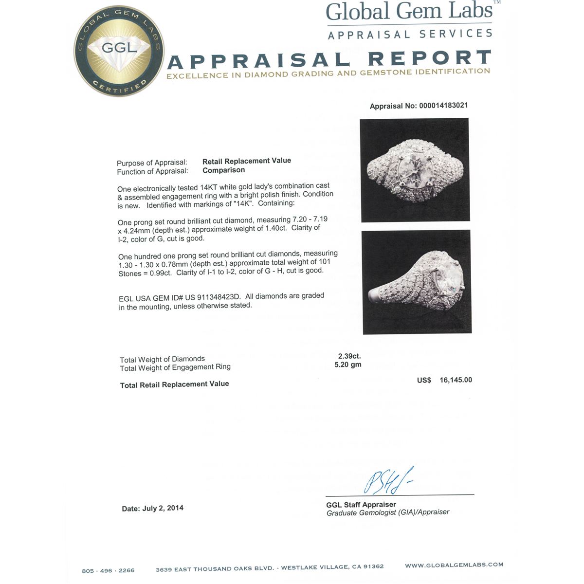 One electronically tested 14KT white gold Ladies combination cast & assembled engagement ring with a bright polish finish. Condition is new. Identified with markings of "14K". Containing: One prong set round brilliant cut diamond, measuring 7.20 - 7.19 x 4.24mm (depth est.) approximate weight of 1.40ct. Clarity: I-2. Color: G, Cut is Good. One Hundred One prong set round brilliant cut diamonds, measuring 1.30 - 1.30 x 0.78mm (depth est.) approximate. Total Weight of 101 Stones = 0.99ct. Clarity: I-1 to I-2. Color: G - H, Cut is Good. EGL USA GEM ID# US 911348423D. All diamonds are graded in the mounting, unless otherwise stated. Total Weight of Diamonds 2.39ct. Total Weight of Engagement Ring 5.20 grams. GGL Appraised at $16,145.00.