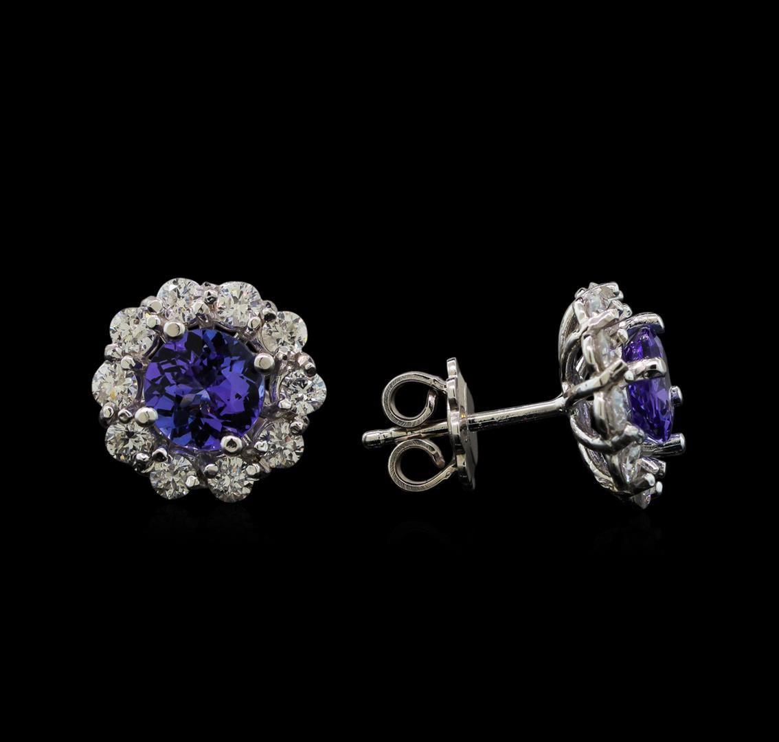 One pair electronically tested 14KT white gold ladies cast tanzanite and diamond earrings with friction posts with a bright polish finish. Identified with markings of "585". Condition is new. Containing: Two prong set round modified brilliant cut natural tanzanites, measuring 6.50 - 6.50 x 4.23 mm, approximate total weight of 2.40ct., clarity is eye clean, type I, medium light, very slightly grayish, violet color, (GIA V 4/3), cut is very good. Twenty prong set round brilliant cut diamonds, measuring 2.40 - 2.40 x 1.44mm (depth est.) approximate total weight of 20 Stones = 1.15ct. Clarity: SI-1 to SI-2. Color: I - J, Cut is Good. Colored gemstones are presumed to have been subjected to commonly used enhancement processes. All diamonds and colored gemstones are graded in the mounting, unless otherwise stated. Total Weight of Colored Stones 2.40ct. Total Weight of Diamonds 1.15ct. Total Weight of Earrings 4.20 grams. GGL Appraised at $3,515.00.