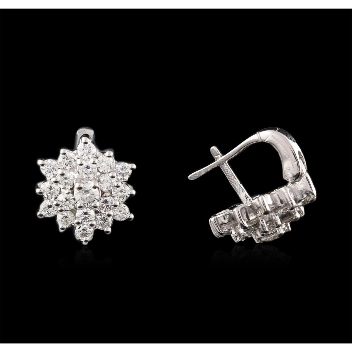 One pair electronically tested 14KT white gold ladies cast diamond earrings with hinged clip backs with a bright polish finish. Identified with markings of "14K". Condition is new. Containing: Thirty-Eight prong set round brilliant cut diamonds, measuring 3.50 - 2.50 x 1.80mm (depth est.) approximate total weight of 38 Stones = 2.40ct. Clarity: SI-1 to SI-2. Color: J, Cut is Good. All diamonds are graded in the mounting, unless otherwise stated. Total Weight of Diamonds 2.40ct. Total Weight of Earrings 7.50 grams. GGL Appraised at $5,975.00.