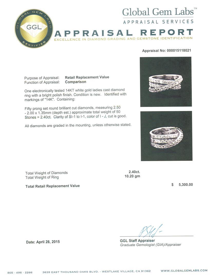 One electronically tested 14KT white gold ladies cast diamond ring with a bright polish finish. Identified with markings of "14K". Condition is new. Containing: Fifty prong set round brilliant cut diamonds, measuring 2.50 - 2.00 x 1.35mm (depth est.) approximate total weight of 50 Stones = 2.40ct. Clarity: SI-1 to I-1. Color: I - J, Cut is Good. All diamonds are graded in the mounting, unless otherwise stated. Total Weight of Diamonds 2.40ct. Total Weight of Ring 10.20 grams. GGL Appraised at $5,300.00.