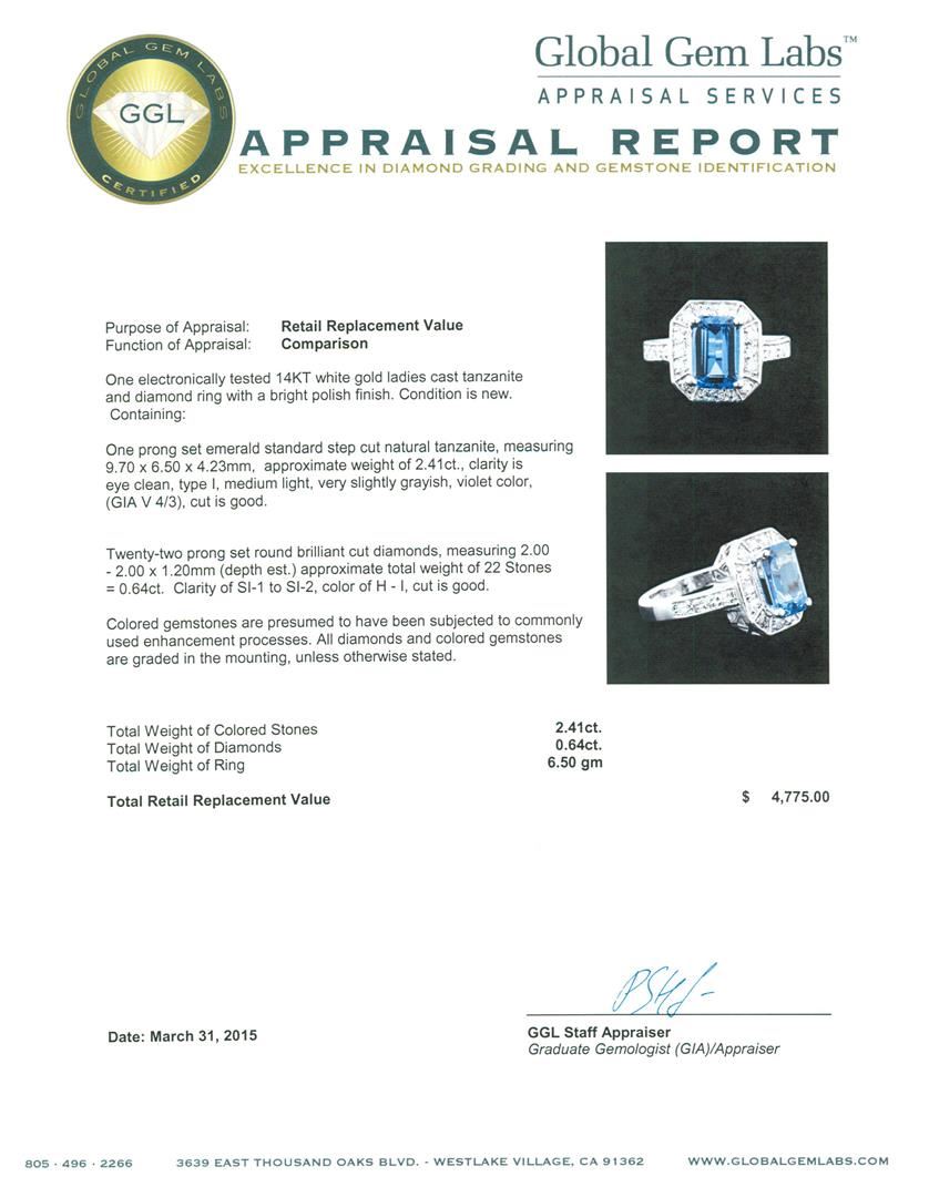 One electronically tested 14KT white gold ladies cast tanzanite and diamond ring with a bright polish finish. Condition is new. Containing: One prong set emerald standard step cut natural tanzanite, measuring 9.70 x 6.50 x 4.23mm, approximate weight of 2.41ct., clarity is eye clean, type I, medium light, very slightly grayish, violet color, (GIA V 4/3), cut is good. Twenty-Two prong set round brilliant cut diamonds, measuring 2.00 - 2.00 x 1.20mm (depth est.) approximate total weight of 22 Stones = 0.64ct. Clarity: SI-1 to SI-2. Color: H - I, Cut is Good. Colored gemstones are presumed to have been subjected to commonly used enhancement processes. All diamonds and colored gemstones are graded in the mounting, unless otherwise stated. Total Weight of Colored Stones 2.41ct. Total Weight of Diamonds 0.64ct. Total Weight of Ring 6.50 grams. GGL Appraised at $4,775.00.