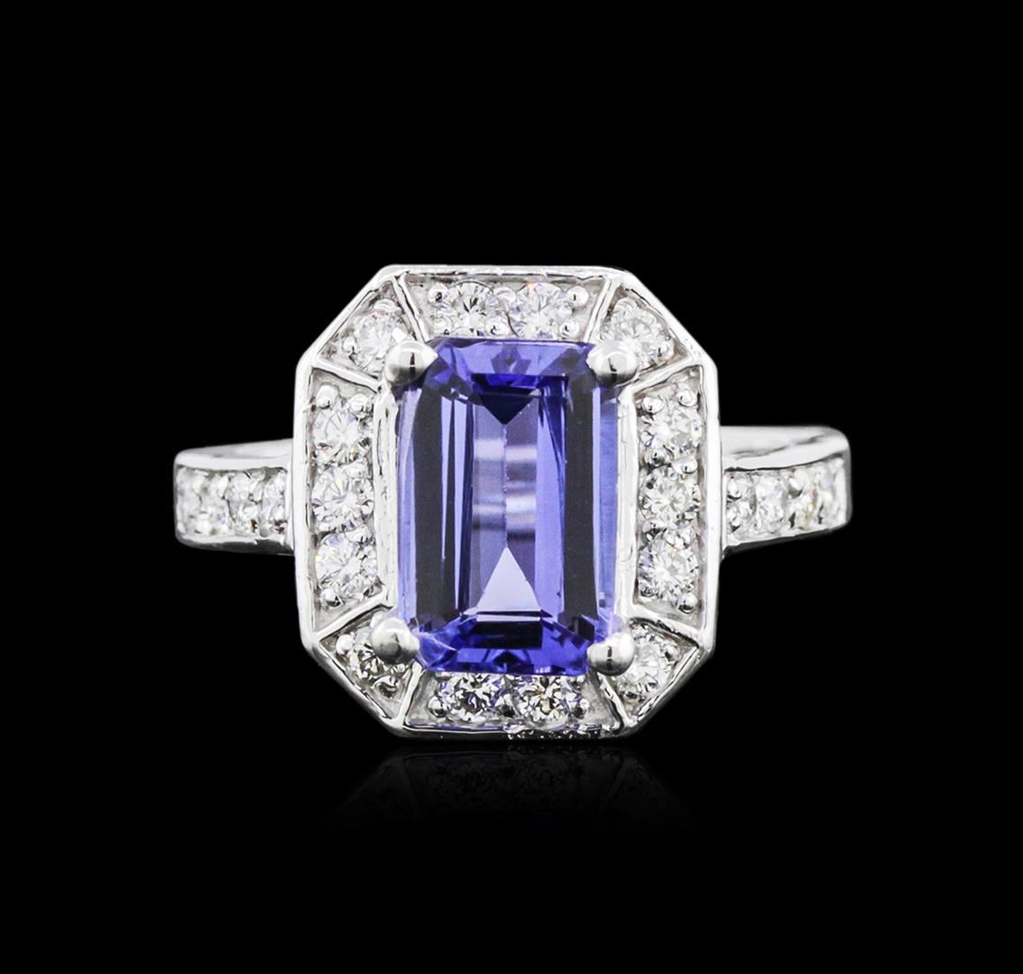 One electronically tested 14KT white gold ladies cast tanzanite and diamond ring with a bright polish finish. Condition is new. Containing: One prong set emerald standard step cut natural tanzanite, measuring 9.70 x 6.50 x 4.23mm, approximate weight of 2.41ct., clarity is eye clean, type I, medium light, very slightly grayish, violet color, (GIA V 4/3), cut is good. Twenty-Two prong set round brilliant cut diamonds, measuring 2.00 - 2.00 x 1.20mm (depth est.) approximate total weight of 22 Stones = 0.64ct. Clarity: SI-1 to SI-2. Color: H - I, Cut is Good. Colored gemstones are presumed to have been subjected to commonly used enhancement processes. All diamonds and colored gemstones are graded in the mounting, unless otherwise stated. Total Weight of Colored Stones 2.41ct. Total Weight of Diamonds 0.64ct. Total Weight of Ring 6.50 grams. GGL Appraised at $4,775.00.