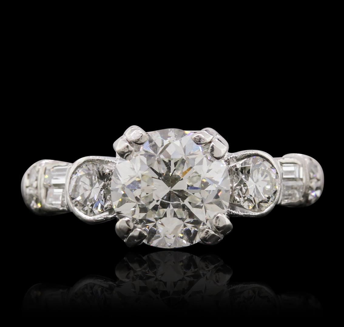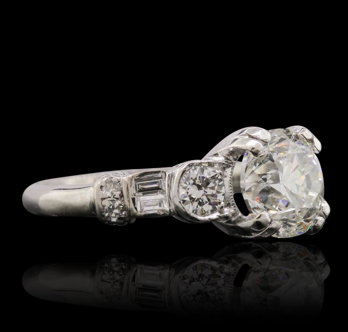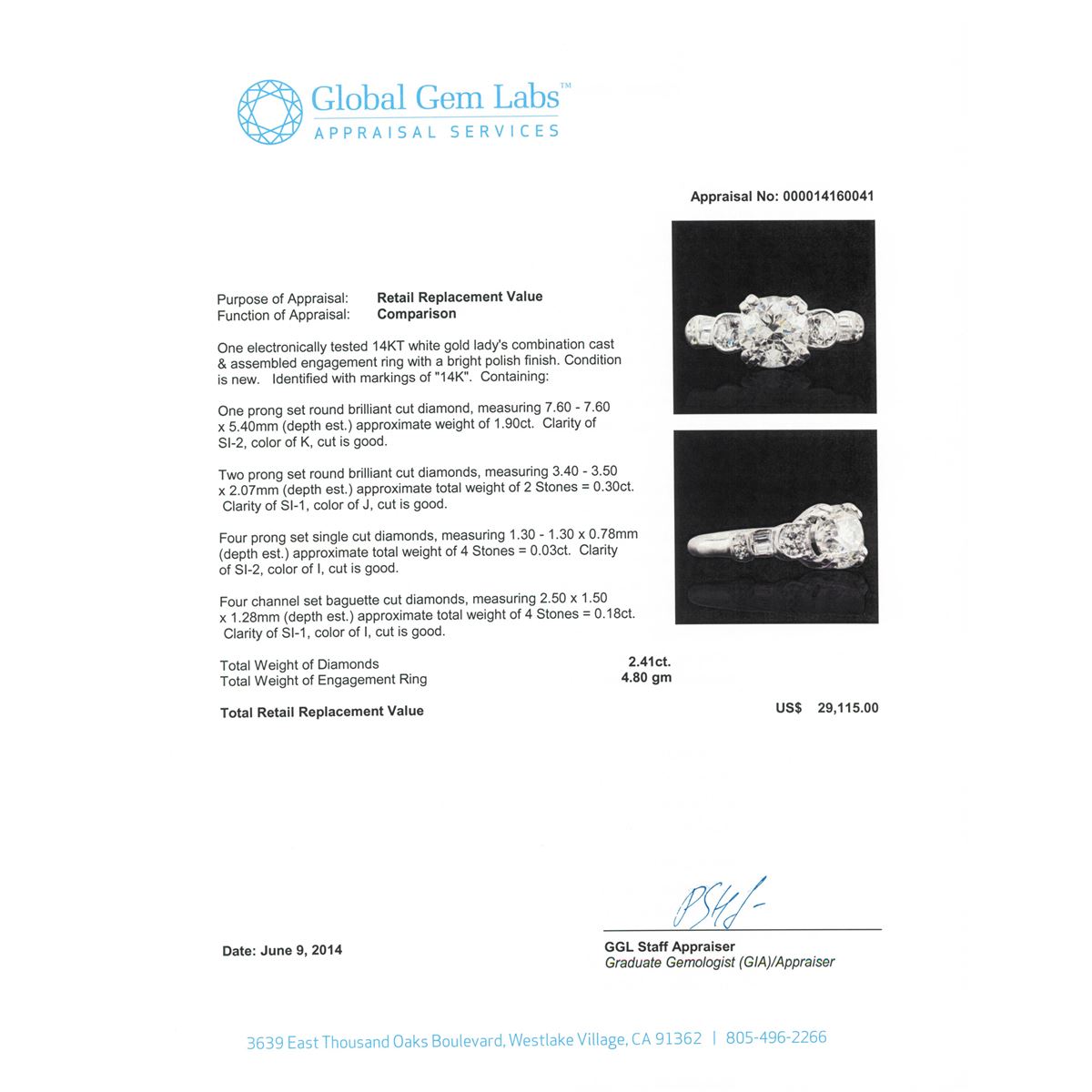 One electronically tested 14KT white gold Ladies combination cast & assembled engagement ring with a bright polish finish. Condition is new. Identified with markings of "14K". Containing: One prong set round brilliant cut diamond, measuring 7.60 - 7.60 x 5.40mm (depth est.) approximate weight of 1.90ct. Clarity: SI-2. Color: K, Cut is Good. Two prong set round brilliant cut diamonds, measuring 3.40 - 3.50 x 2.07mm (depth est.) approximate. Total Weight of 2 Stones = 0.30ct. Clarity: SI-1. Color: J, Cut is Good. Four prong set single cut diamonds, measuring 1.30 - 1.30 x 0.78mm (depth est.) approximate. Total Weight of 4 Stones = 0.03ct. Clarity: SI-2. Color: I, Cut is Good. Four channel set baguette cut diamonds, measuring 2.50 x 1.50 x 1.28mm (depth est.) approximate. Total Weight of 4 Stones = 0.18ct. Clarity: SI-1. Color: I, Cut is Good. Total Weight of Diamonds 2.41ct. Total Weight of Engagement Ring 4.80 grams. GGL Appraised at $29,115.00.