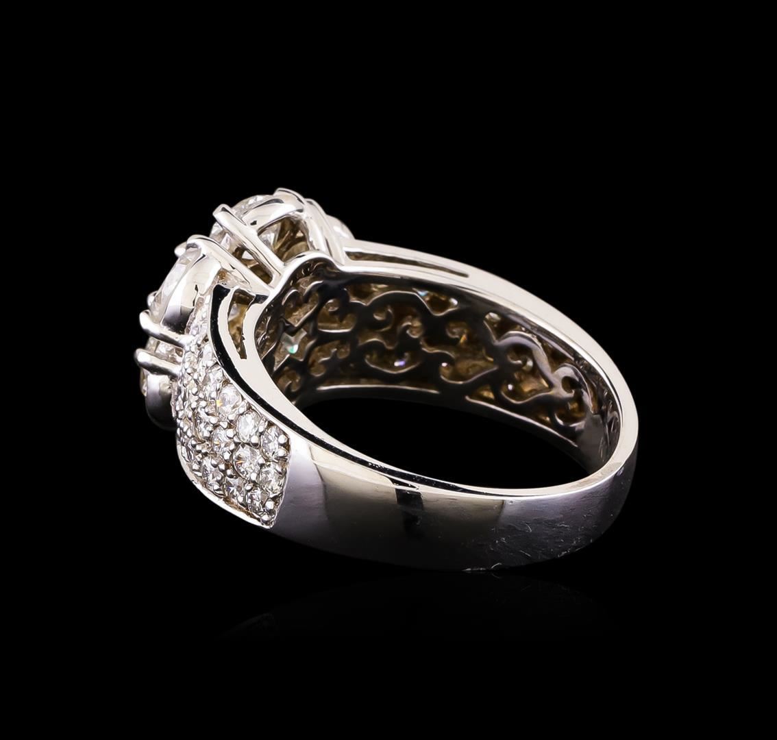 One electronically tested 14KT white gold ladies cast diamond ring with a bright polish finish. Identified with markings of "K14". Condition is new. Containing: Seven prong set round brilliant cut diamonds, measuring 3.90 - 3.90 x 2.34mm (depth est.) approximate total weight of 7 Stones = 1.52ct. Clarity: SI-1 to SI-2. Color: J, Cut is Good. Thirty-Six prong set round brilliant cut diamonds, measuring 1.90 - 1.90 x 1.14mm (depth est.) approximate total weight of 36 Stones = 0.90 ct. Clarity: SI-1 to SI-2. Color: J - K, Cut is Good. All diamonds are graded in the mounting, unless otherwise stated. Total Weight of Diamonds 2.42ct. Total Weight of Ring 6.90 grams. GGL Appraised.