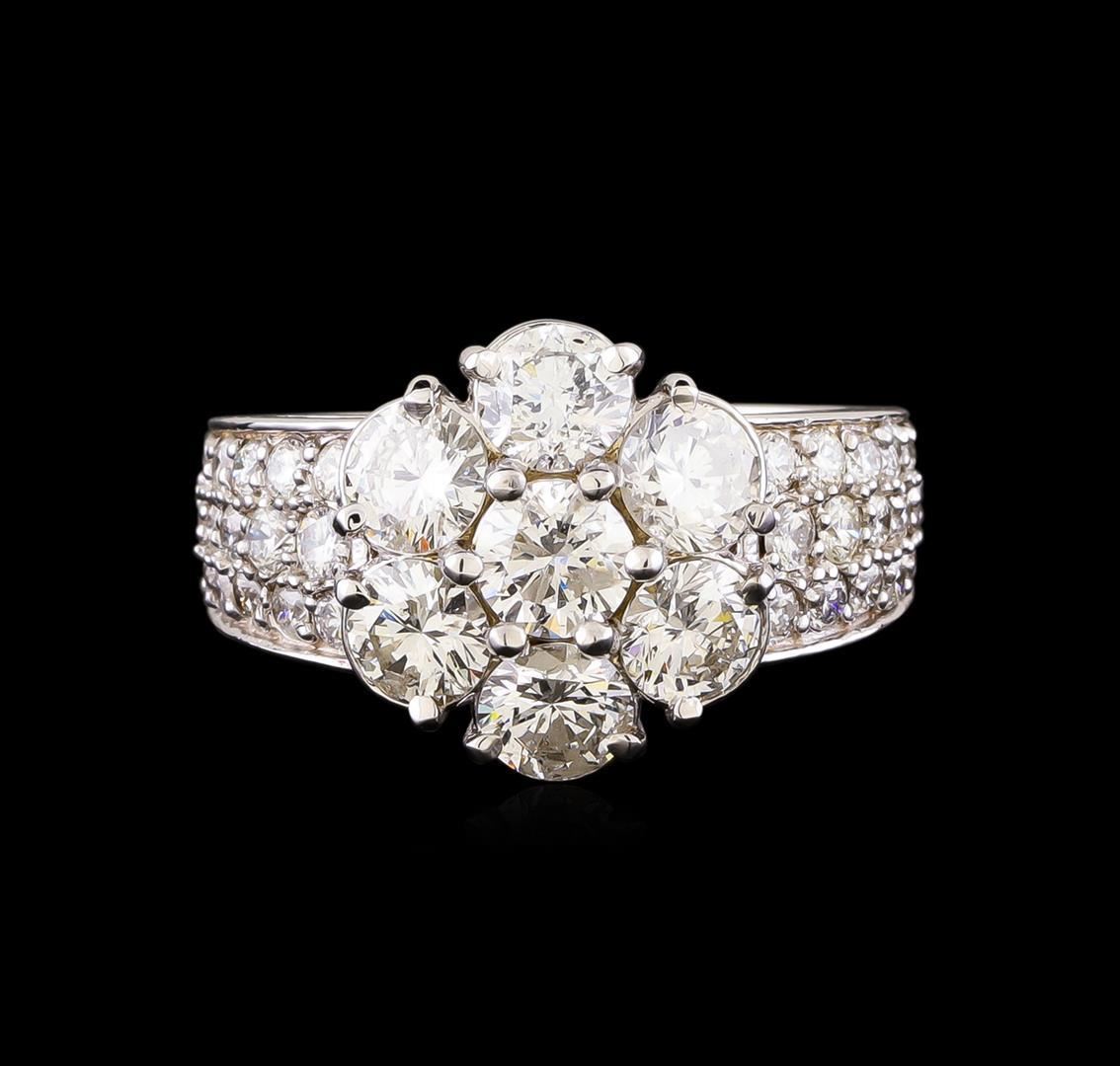 One electronically tested 14KT white gold ladies cast diamond ring with a bright polish finish. Identified with markings of "K14". Condition is new. Containing: Seven prong set round brilliant cut diamonds, measuring 3.90 - 3.90 x 2.34mm (depth est.) approximate total weight of 7 Stones = 1.52ct. Clarity: SI-1 to SI-2. Color: J, Cut is Good. Thirty-Six prong set round brilliant cut diamonds, measuring 1.90 - 1.90 x 1.14mm (depth est.) approximate total weight of 36 Stones = 0.90 ct. Clarity: SI-1 to SI-2. Color: J - K, Cut is Good. All diamonds are graded in the mounting, unless otherwise stated. Total Weight of Diamonds 2.42ct. Total Weight of Ring 6.90 grams. GGL Appraised.