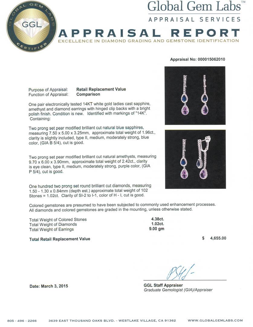 One pair electronically tested 14KT white gold ladies cast sapphire, amethyst and diamond earrings with hinged clip backs with a bright polish finish. Identified with markings of "14K". Condition is new. Containing: Two prong set pear modified brilliant cut natural blue sapphires, measuring 7.50 x 5.00 x 3.25mm, approximate total weight of 1.96ct., clarity is slightly included, type II, medium, moderately strong, blue color, (GIA B 5/4), cut is good. Two prong set pear modified brilliant cut natural amethysts, measuring 9.70 x 6.00 x 3.90mm, approximate total weight of 2.42ct., clarity is eye clean, type II, medium, moderately strong, purple color, (GIA P 5/4), cut is good. One Hundred Two prong set round brilliant cut diamonds, measuring 1.50 - 1.30 x 0.84mm (depth est.) approximate total weight of 102 Stones = 1.02ct. Clarity: SI-2 to I-1. Color: H - I, Cut is Good. Colored gemstones are presumed to have been subjected to commonly used enhancement processes. All diamonds and colored gemstones are graded in the mounting, unless otherwise stated. Total Weight of Colored Stones 4.38ct. Total Weight of Diamonds 1.02ct. Total Weight of Earrings 9.00 grams. GGL Appraised at $4,655.00.