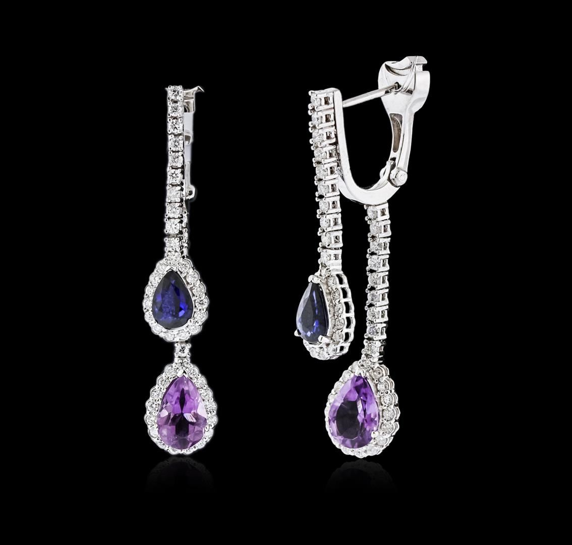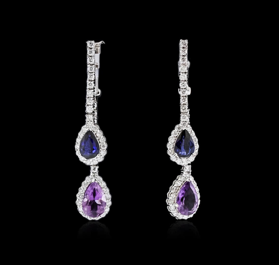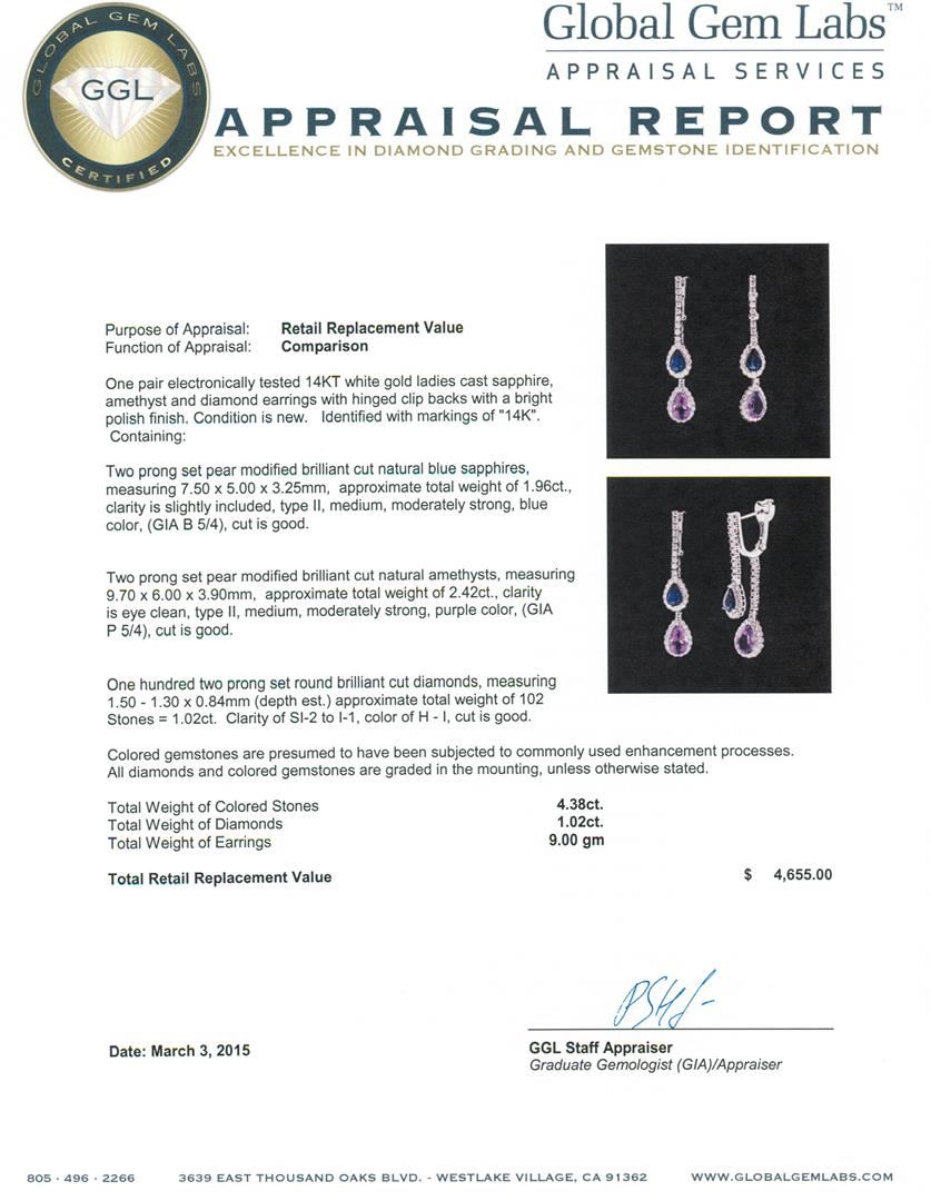 One pair electronically tested 14KT white gold ladies cast sapphire, amethyst and diamond earrings with hinged clip backs with a bright polish finish. Identified with markings of "14K". Condition is new. Containing: Two prong set pear modified brilliant cut natural blue sapphires, measuring 7.50 x 5.00 x 3.25mm, approximate total weight of 1.96ct., clarity is slightly included, type II, medium, moderately strong, blue color, (GIA B 5/4), cut is good. Two prong set pear modified brilliant cut natural amethysts, measuring 9.70 x 6.00 x 3.90mm, approximate total weight of 2.42ct., clarity is eye clean, type II, medium, moderately strong, purple color, (GIA P 5/4), cut is good. One Hundred Two prong set round brilliant cut diamonds, measuring 1.50 - 1.30 x 0.84mm (depth est.) approximate total weight of 102 Stones = 1.02ct. Clarity: SI-2 to I-1. Color: H - I, Cut is Good. Colored gemstones are presumed to have been subjected to commonly used enhancement processes. All diamonds and colored gemstones are graded in the mounting, unless otherwise stated. Total Weight of Colored Stones 4.38ct. Total Weight of Diamonds 1.02ct. Total Weight of Earrings 9.00 grams. GGL Appraised at $4,655.00.