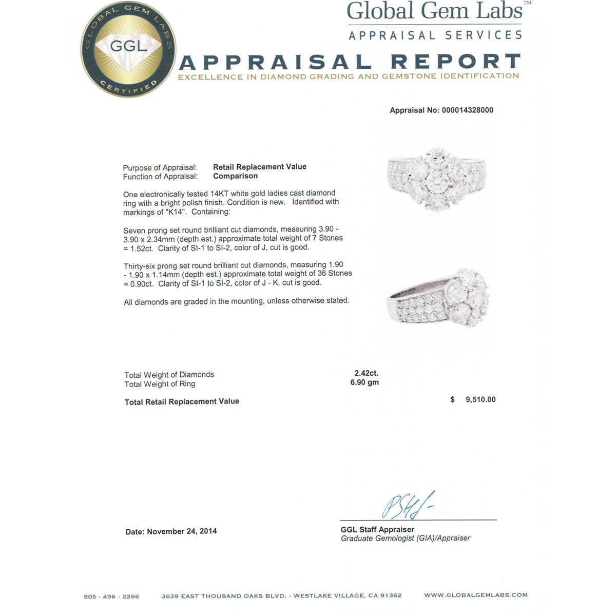 One electronically tested 14KT white gold ladies cast diamond ring with a bright polish finish. Identified with markings of "K14". Condition is new. Containing: Seven prong set round brilliant cut diamonds, measuring 3.90 - 3.90 x 2.34mm (depth est.) approximate total weight of 7 Stones = 1.52ct. Clarity: SI-1 to SI-2. Color: J, Cut is Good. Thirty-Six prong set round brilliant cut diamonds, measuring 1.90 - 1.90 x 1.14mm (depth est.) approximate total weight of 36 Stones = 0.90ct. Clarity: SI-1 to SI-2. Color: J - K, Cut is Good. All diamonds are graded in the mounting, unless otherwise stated. Total Weight of Diamonds 2.42ct. Total Weight of Ring 6.90 grams. GGL Appraised at $9,510.00.