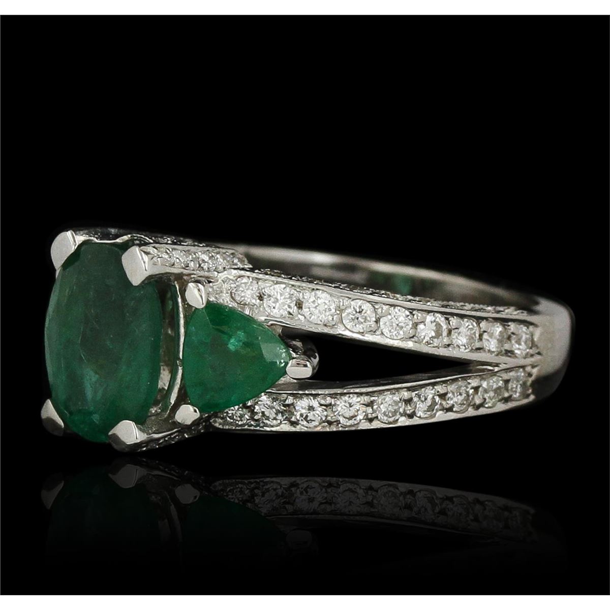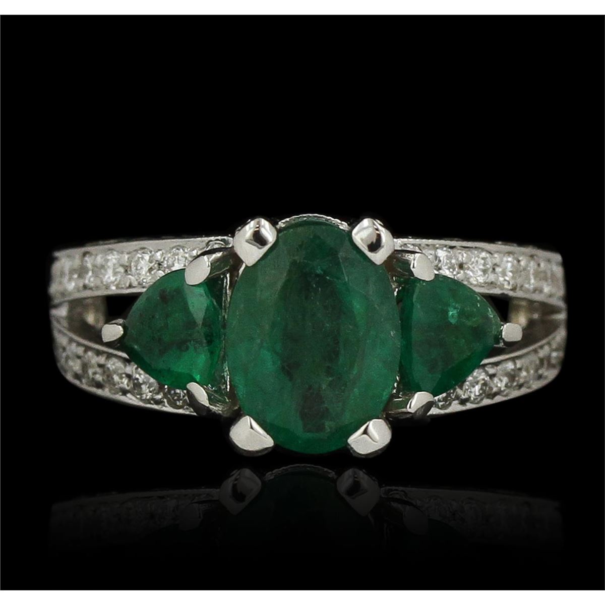 One electronically tested 14KT white gold ladies cast emerald and diamond ring. Condition is new, good workmanship. The featured emerald is accented by a single emerald on either side supported by diamond set split shoulders, completed by a three millimeter wide band. Bright polish finish with milgrain detailing. Identified with markings of "14K". Containing: One prong set oval mixed cut natural emerald, measuring 9.05 x 6.80 x 4.05mm, 6%. bulge factor, approximate weight of 1.47ct., clarity is heavily included, type III, medium dark, moderately strong, very slightly bluish green color, (GIA vslbG 6/4), cut is good. Transmitting light with a minimum of distortion, transparent. Naturally occurring internal & external characteristics are present. Indications of oil residue. Graded in the setting. Two prong set triangle mixed cut natural emeralds, measuring 5.10 x 5.00 x 3.25mm, approximate. Total Weight of 0.95ct., clarity is heavily included, type III, medium dark, moderately strong, very slightly bluish green color, (GIA vslbG 6/4), cut is good. Transmitting light with a minimum of distortion, transparent. Naturally occurring internal & external characteristics are present. Measurements & the color grade are an average for the group. Indications of oil residue. Graded in the setting. Sixty-Eight bead set round brilliant cut diamonds, measuring 1.60 - 1.40 x 0.90mm (depth est.) approximate. Total Weight of 68 Stones = 0.94ct. Graded in the setting. Clarity: VS-1 to SI-1. Color: G - I Thirty bead set round brilliant cut diamonds, measuring 1.10 - 1.00 x 0.63mm (depth est.) approximate. Total Weight of 30 Stones = 0.22ct. Graded in the setting. Clarity: VS-1 to SI-1. Color: G - I. Total Weight of Colored Stones 2.42ct. Total Weight of Diamonds 1.16ct. Total Weight of Ring 7.15 grams. AIG Appraised at $8,345.00.