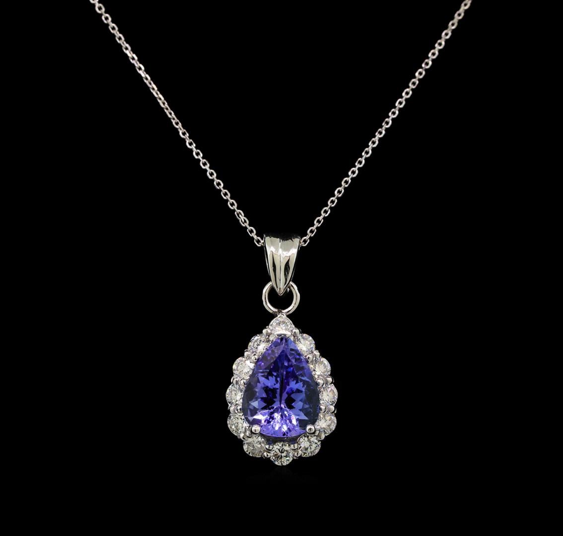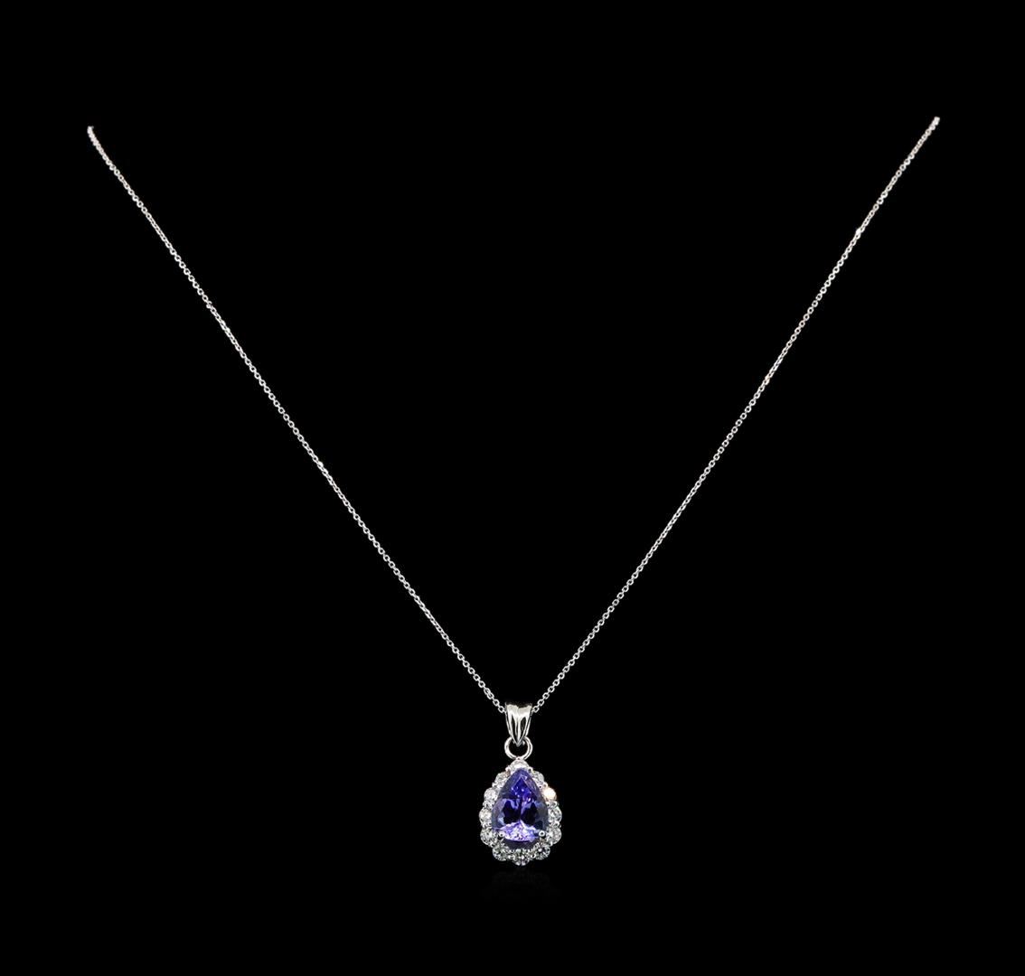 One electronically tested 14KT white gold ladies cast tanzanite and diamond pendant & chain 16.0" long, cable link with a spring ring clasp with a bright and brushed finish. Identified with markings of "14K". Condition is new. Containing: One prong set pear modified brilliant cut natural tanzanite, measuring 9.25 x 7.77 x 5.05mm, approximate weight of 2.43ct., clarity is eye clean, type I, medium, moderately strong, violet color, (GIA V 5/4), cut is good. Twelve prong set round brilliant cut diamonds, measuring 2.50 - 2.50 x 1.50mm (depth est.) approximate total weight of 12 Stones = 0.69ct. Clarity: SI-1 to SI-2. Color: I - J, Cut is Good. Colored gemstones are presumed to have been subjected to commonly used enhancement processes. All diamonds and colored gemstones are graded in the mounting, unless otherwise stated. Total Weight of Colored Stones 2.43ct. Total Weight of Diamonds 0.69ct. Total Weight of Pendant & Chain 3.80 grams. GGL Appraised at $3,590.00.