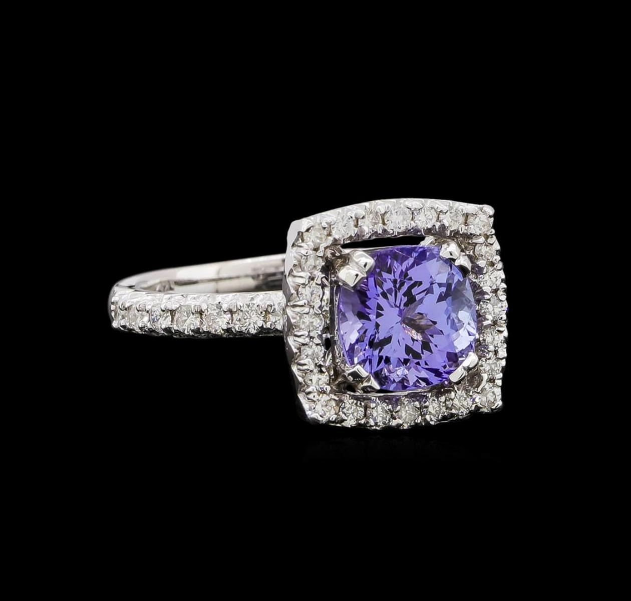 One electronically tested 14KT white gold ladies cast tanzanite and diamond ring with a bright polish finish. Identified with markings of "14K". Condition is new. Containing: One prong set square cushion modified brilliant cut natural tanzanite, measuring 7.80 x 7.80 x 5.07mm, approximate weight of 2.43ct., clarity is eye clean, type I, medium light, very slightly grayish, violet color, (GIA V 4/3), cut is good. Forty-Two prong set round brilliant cut diamonds, measuring 1.50 - 1.30 x 0.84mm (depth est.) approximate total weight of 42 Stones = 0.42ct. Clarity: SI-1 to I-1. Color: I - J, Cut is Good. Colored gemstones are presumed to have been subjected to commonly used enhancement processes. All diamonds and colored gemstones are graded in the mounting, unless otherwise stated. Total Weight of Colored Stones 2.43ct. Total Weight of Diamonds 0.42ct. Total Weight of Ring 5.60 grams. GGL Appraised.