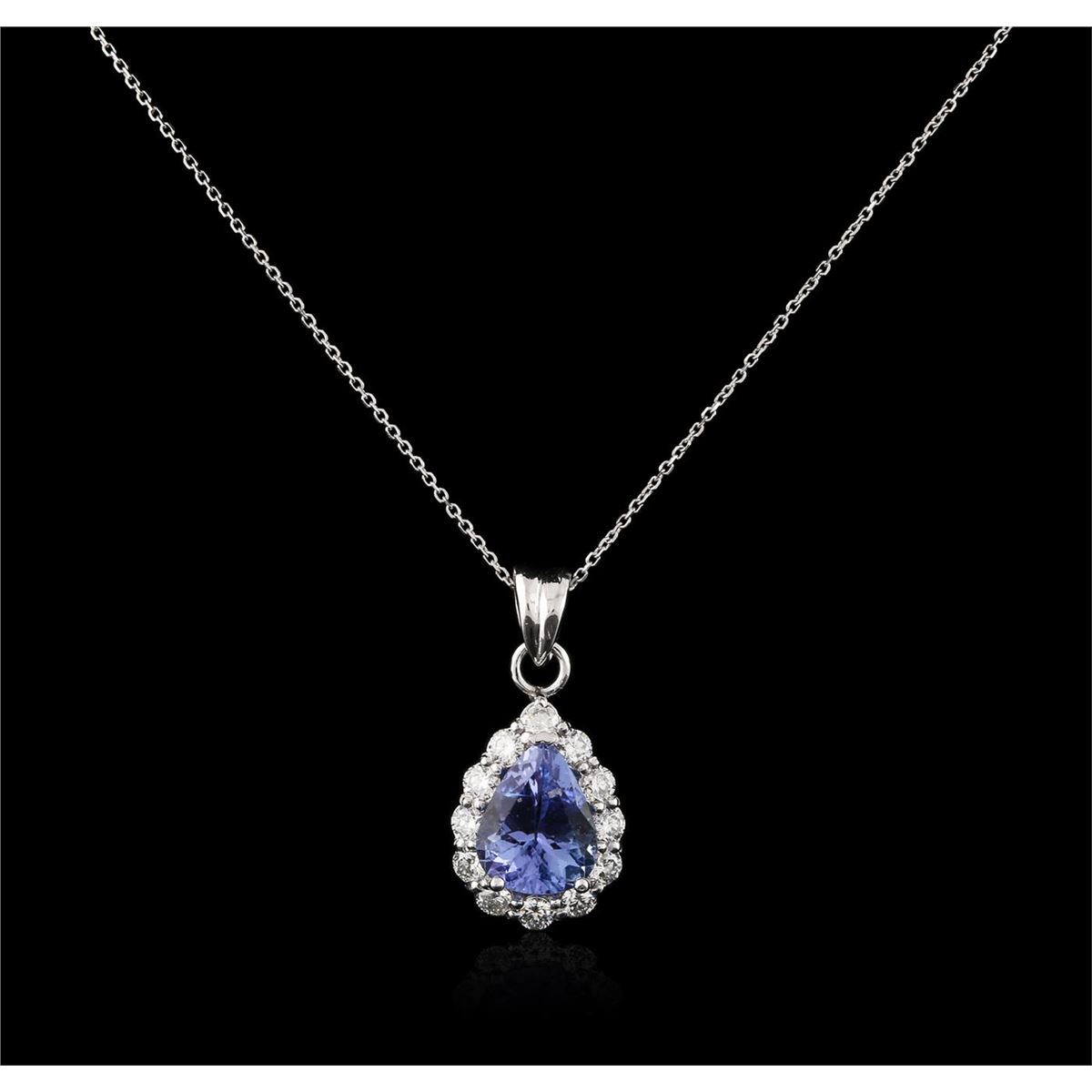 One electronically tested 14KT white gold ladies cast tanzanite and diamond pendant & chain 16.0" long, cable link with a spring ring clasp with a bright and brushed finish. Identified with markings of "14K". Condition is new. Containing: One prong set pear modified brilliant cut natural tanzanite, measuring 9.25 x 7.77 x 5.05mm, approximate weight of 2.43ct., clarity is eye clean, type I, medium, moderately strong, violet color, (GIA V 5/4), cut is good. Twelve prong set round brilliant cut diamonds, measuring 2.50 - 2.50 x 1.50mm (depth est.) approximate total weight of 12 Stones = 0.69ct. Clarity: SI-1 to SI-2. Color: I - J, Cut is Good. Colored gemstones are presumed to have been subjected to commonly used enhancement processes. All diamonds and colored gemstones are graded in the mounting, unless otherwise stated. Total Weight of Colored Stones 2.43ct. Total Weight of Diamonds 0.69ct. Total Weight of Pendant & Chain 3.80 grams. GGL Appraised at $3,590.00.